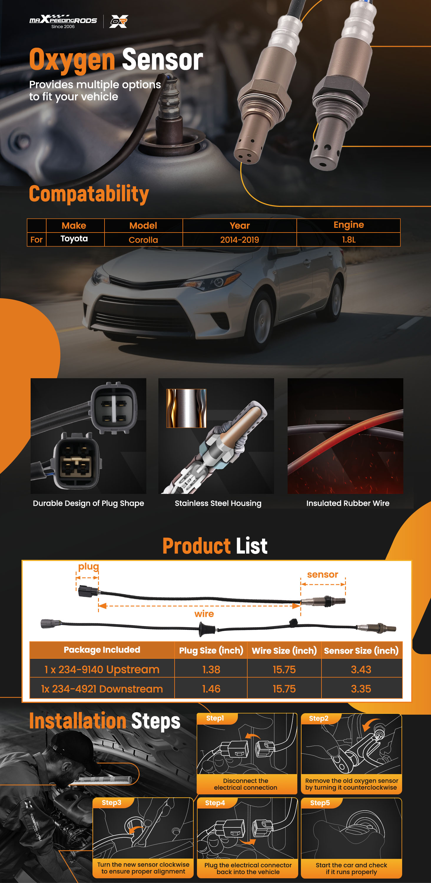 【High Quality Material】The oxygen sensor is equipped with a stainless steel housing. Durable and corrosion-resistant, ensuring your engine's long-lasting and stable performance.