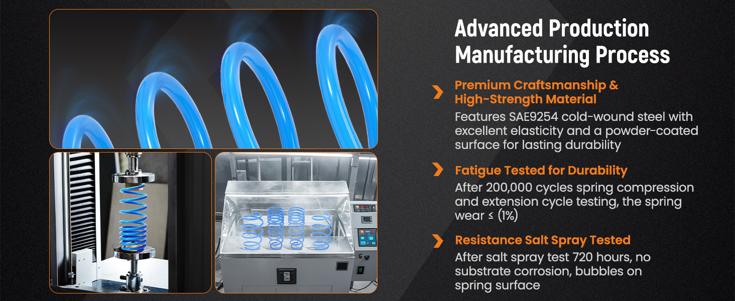 Crafted from premium SAE 9254 cold-wound steel, maXpeedingrods lowering springs have successfully endured rigorous testing, including a 200,000-cycle fatigue test and a 720-hour salt spray test. This ensures unparalleled durability and resistance to corrosion, providing you with peace of mind and long-lasting performance.