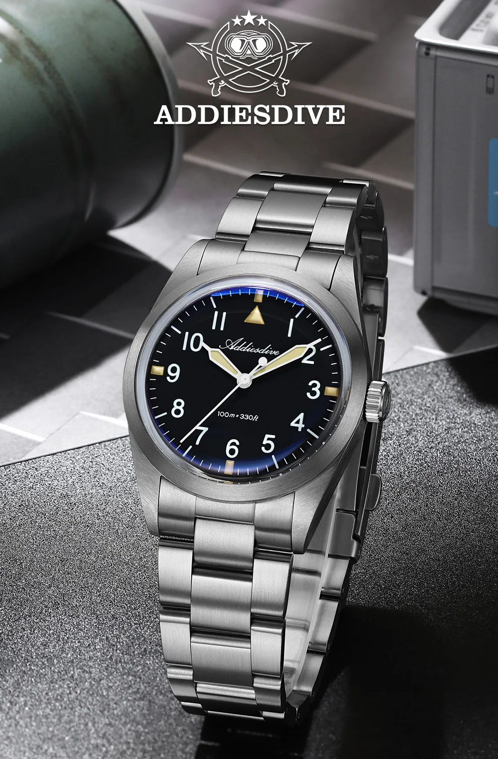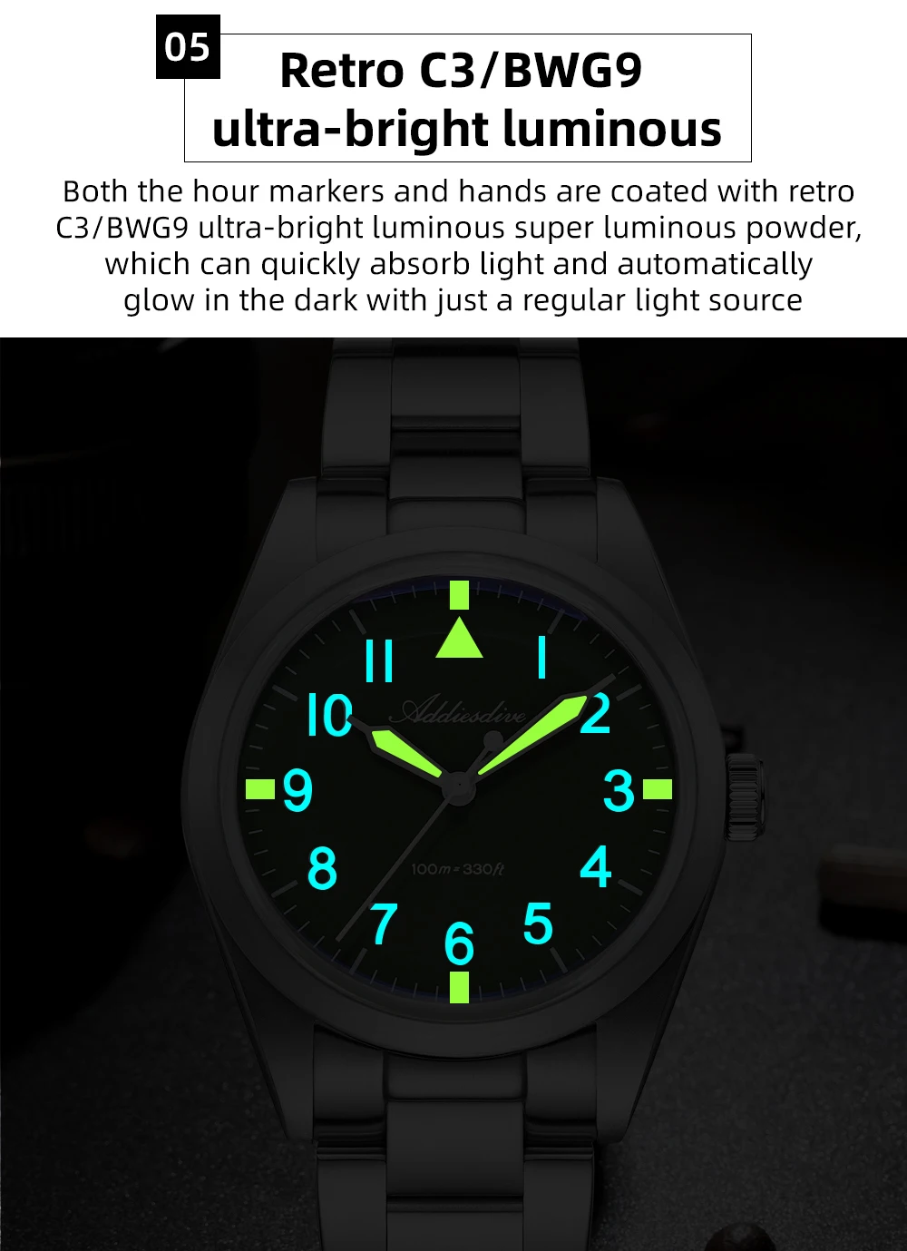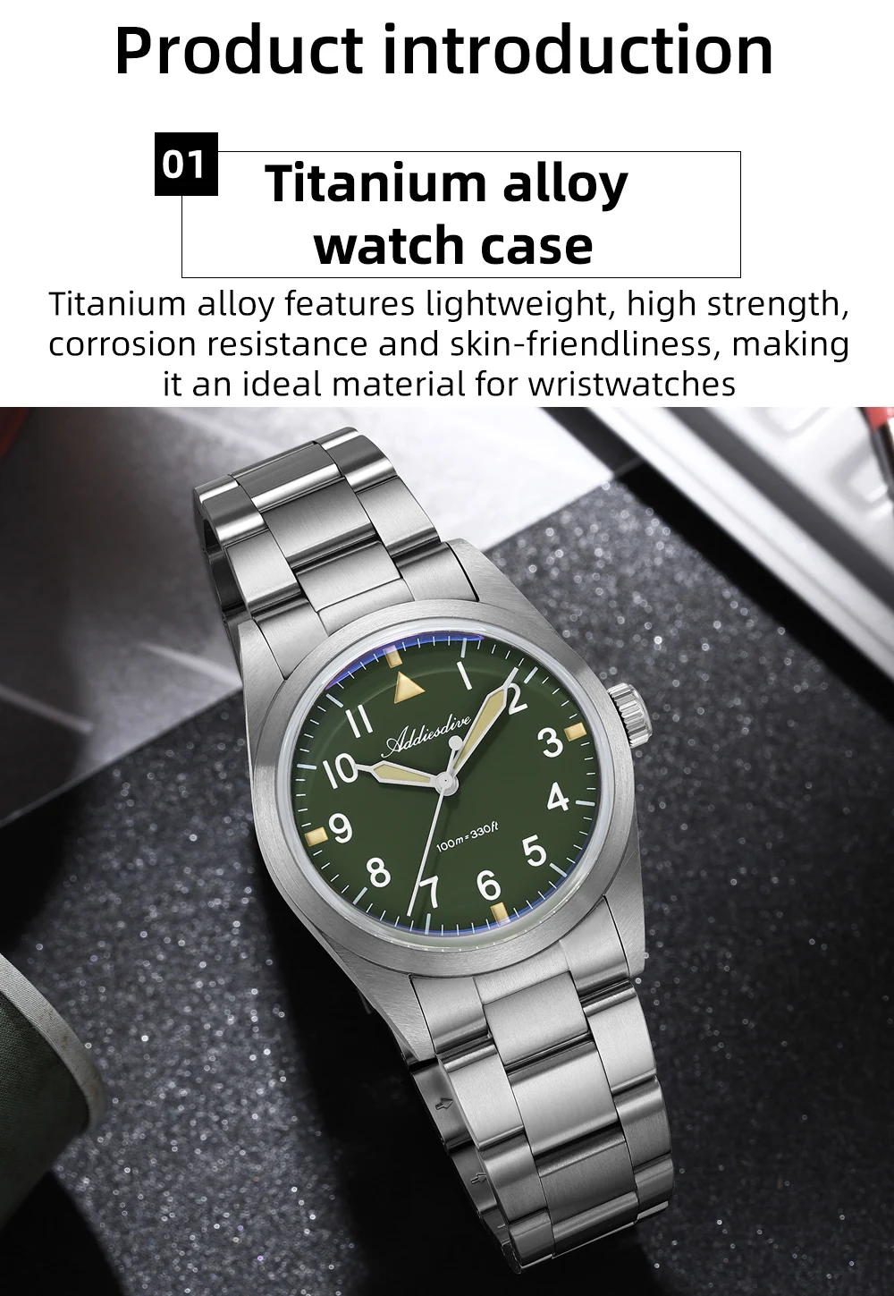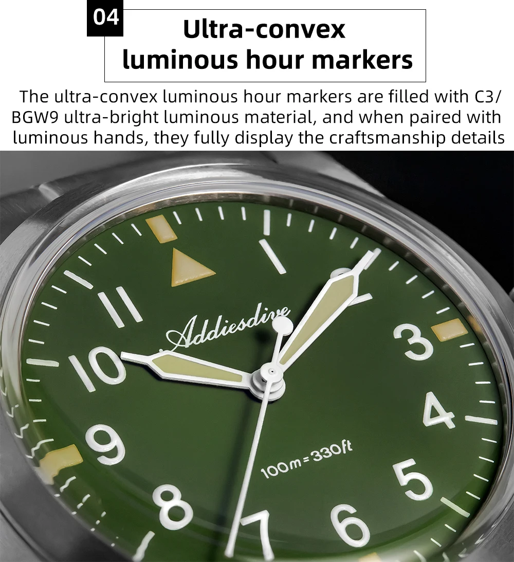 Inspired by military equipment, this watch uses lightweight, strong, and corrosion-resistant Grade 2 titanium alloy for both the case and strap, ensuring military-grade reliability and durability. The deep military green dial restores the classic military color palette, while the contrasting BGW9 and C3 luminous colors create a striking military-style look. The use of titanium alloy makes this timepiece both a functional tool and a distinctive highlight in your collection.