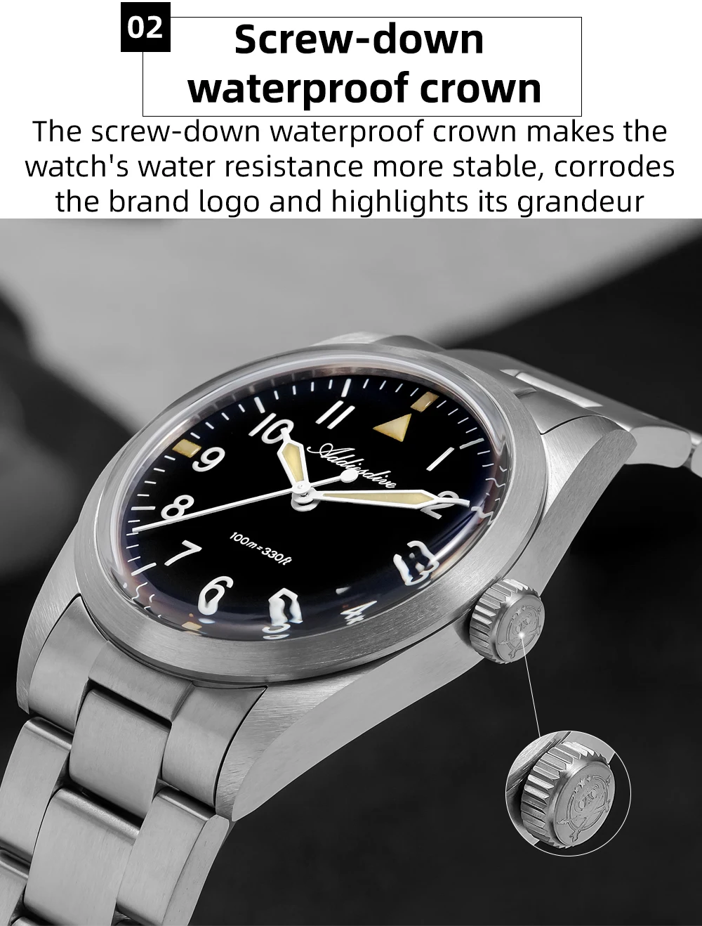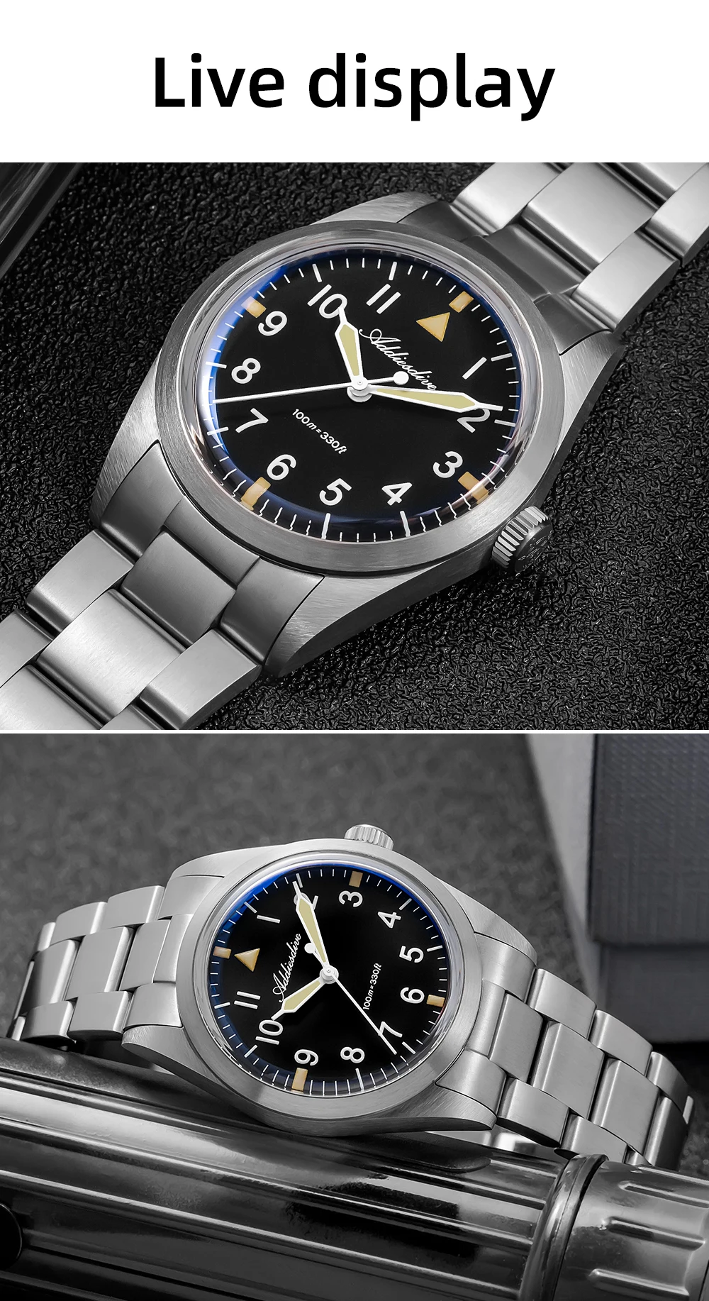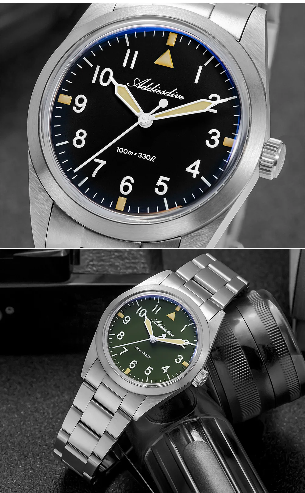 Inspired by military equipment, this watch uses lightweight, strong, and corrosion-resistant Grade 2 titanium alloy for both the case and strap, ensuring military-grade reliability and durability. The deep military green dial restores the classic military color palette, while the contrasting BGW9 and C3 luminous colors create a striking military-style look. The use of titanium alloy makes this timepiece both a functional tool and a distinctive highlight in your collection.