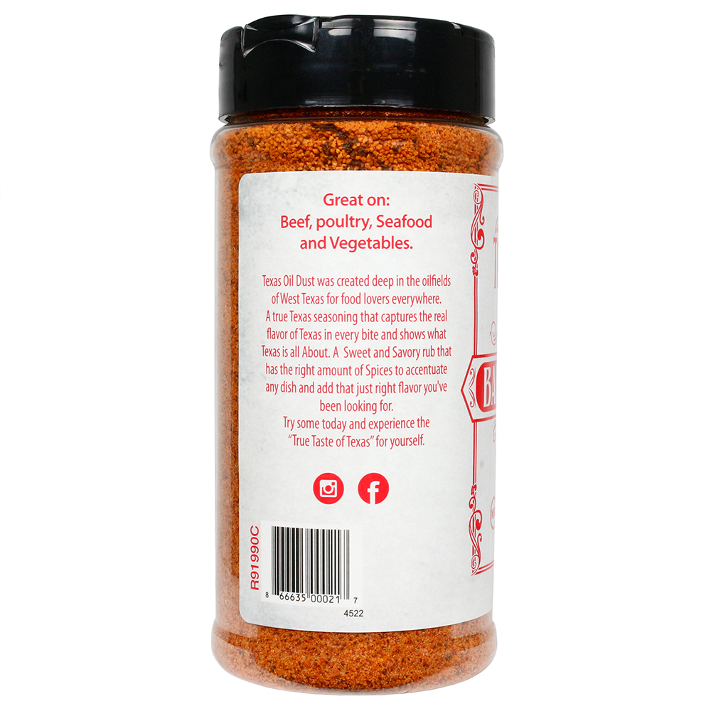 Texas Oil Dust's Barnyard Pimp Rub brings out the lip-smackin' chicken flavor everyone desires. This award-winning seasoning is a proven winner on the competition trail and in the kitchen. Made for chicken, but it also goes great on pork, veggies, seafood, and more! A savory blend of spices with a touch of sweet heat, this seasoning is a must in every grillmaster's arsenal. Please see below for more features and specifications.
