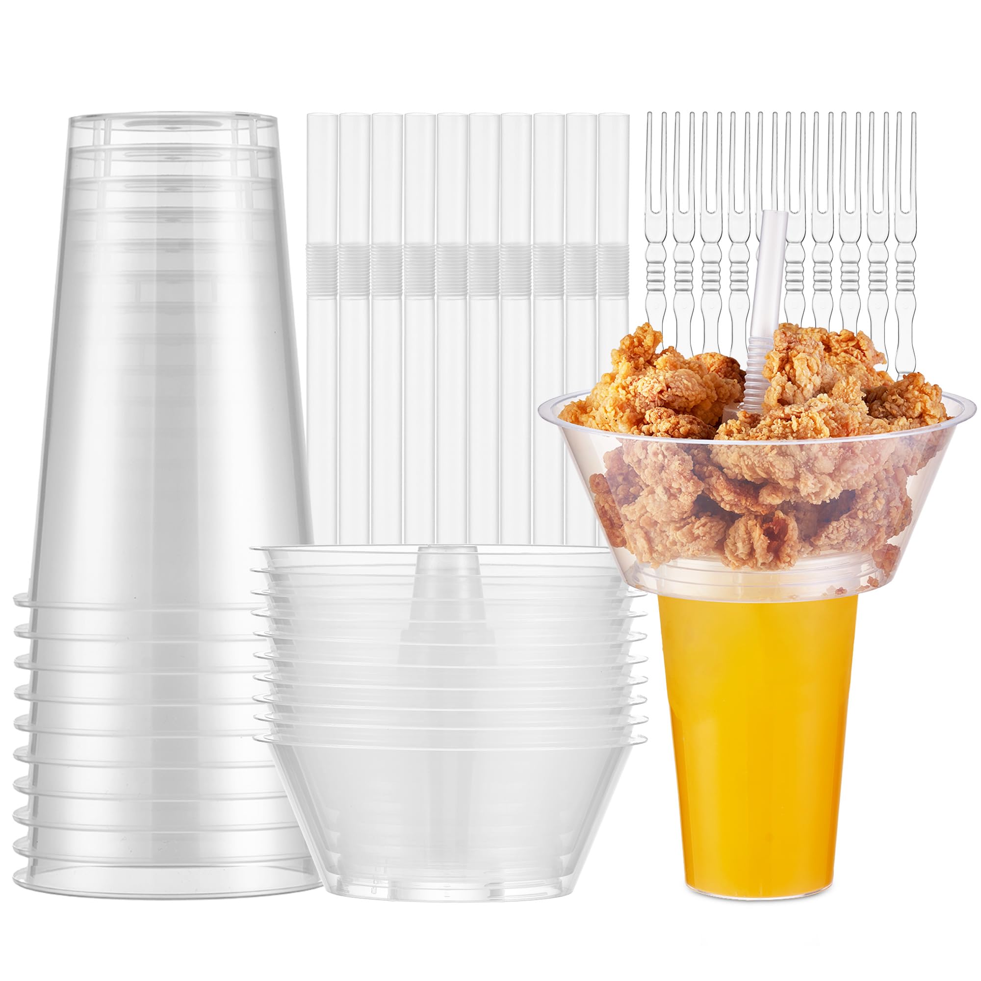 Casarak Snack and Drink Cup, 10 Sets Disposable Plastic Cup with Snack Bowl on Top Includes 10 Cups, 10 Bowls,10 Straws, 20 Forks for Party, Stadium, Patron and Movie Night