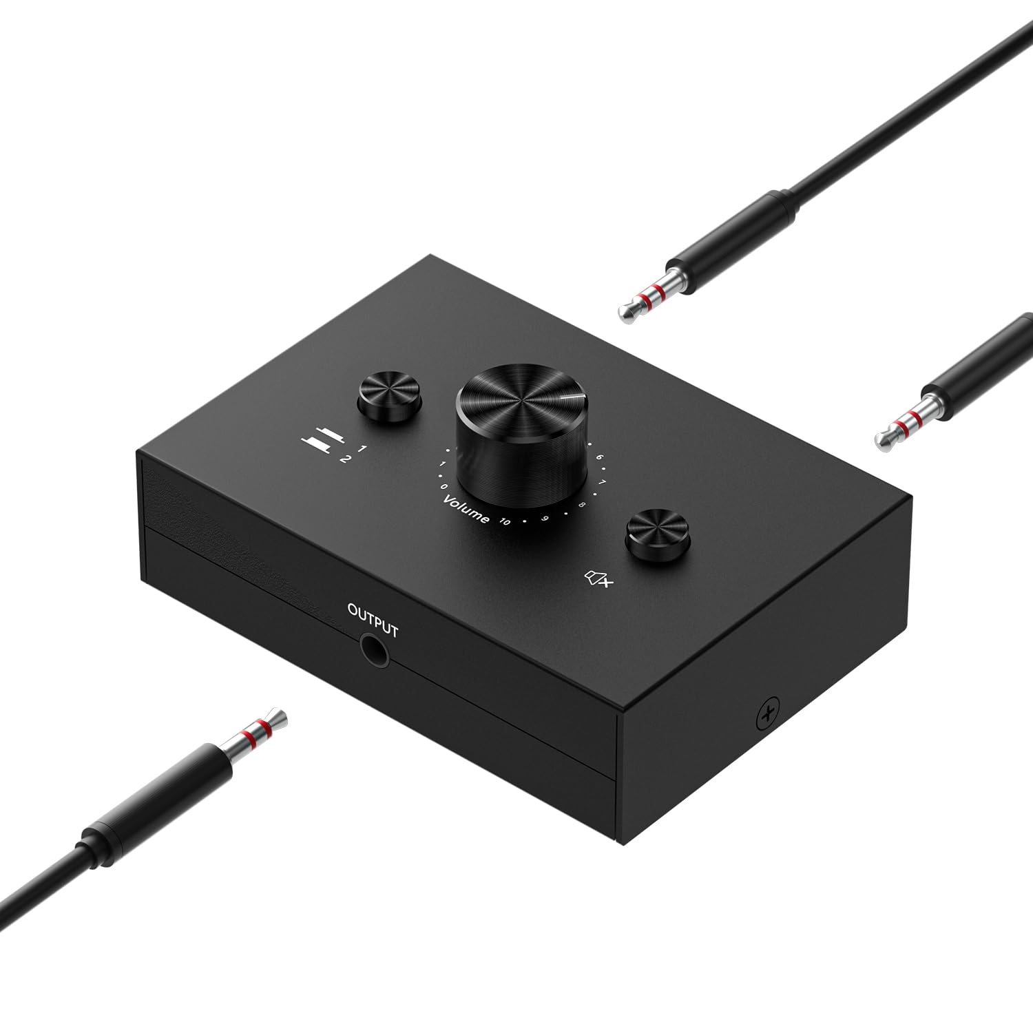 3.5mm Audio selector switcherThis is a bidirectional switcher for 3.5mm audio ports.3.5mm audio selector designed for customers having several audio sources and outputs.Main functions:① Select audio input between 1 and 2 with 1/2 switcher and get one output;How to use:① connect two audio sources (like CD player / computer) to 1/2 ports and one audio output (like speakers) to IN/OUT port;Features:Easy installation and simple operation.Only need to lightly press to mute the device; very useful under special conditions.Plug and play; No power supply and other software required; Won't affect sound quality.Analog signal maximum support 2V p-p input and output.Input and output frequency range: 20Hz ~ 20KHz.Use standard audio cable, input transmission distance up to 8 meters, output transmission distance up to 8 meters.Super small size; Compact and super mini size; Easy to place and suitable for your desktop and office.Note: Only three-segment headphones are supported (four-segment headphones are not supported)Package contains:1* 3.5mm Audio Switch Switcher1* 3.5mm Audio cable1* User manualNote: Only one input can be played at a time.
