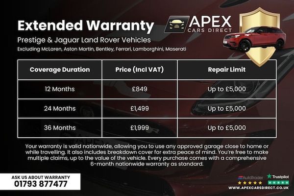 Apex Cars Direct are proud to present this outstanding Land Rover Discovery 3.0 D250 MHEV R-Dynamic SE, finished in Hakuba Silver and presented in excellent condition throughout. This Discovery benefits from a full Land Rover and Specialist Service History with its last service in February 2025 at 37,265 miles. However, it will be supplied with a fresh service ready for its new owner. SUPPLIED WITH: • Full Land Rover & Specialist Service History • Fresh Service Provided • 12 Month MOT Provided • 6 Month Nationwide Warranty Included with an option to upgrade to a 12 Month Warranty from £849. • Passed Our Comprehensive 163-Point Inspection • HPI Clear & Professionally Prepared KEY HIGHLIGHTS: • Black Contrast Roof • Sliding Front Sunroof with Fixed Rear Panoramic Roof • 3D Surround Camera • 21in Alloy Wheels - Style 5123 - Gloss Dark Grey Diamond Turned • Grained Leather Interior - Light Oyster / Ebony • 18-Way Heated Electric Memory Front Seats with Captains Armrests • Electronic Air Suspension • Meridian Sound System • R-Dynamic Exterior Pack LUXURY & COMFORT: • 60/40 Electric Folding Rear Seats with Powered Recline • Manual Third Row Seating (7 Seats) • Two-Zone Climate Control • Heated Windscreen & Heated Rear Window • Heated Electric Memory Door Mirrors • Electrically Adjustable Steering Column • Ebony Morzine Headlining • Premium Carpet Mats TECHNOLOGY & INFOTAINMENT: • 11.4in Pivi Pro Touchscreen • Interactive Driver Display • Apple CarPlay & Android Auto • DAB Radio & Online Pack with Data Plan • Meridian Sound System • Keyless Entry & Push Button Start • Secure Tracker (Subscription from New) DRIVER ASSISTANCE: • 3D Surround Camera • Front & Rear Parking Aid • Blind Spot Assist • Lane Keep Assist • Rear Traffic Monitor • Traffic Sign Recognition with Adaptive Speed Limiter • Driver Condition Monitor • Emergency Braking CAPABILITY & PRACTICALITY: • Electronic Air Suspension • Terrain Response with Single Speed Transfer Box • Hill Descent Control & Hill Launch Assist • Wade Sensing • Trailer Stability Control • Powered Tailgate with Powered Inner Tailgate • Privacy Glass • Reduced Section Alloy Spare Wheel PERSONALISED WALK AROUND VIDEO AVAILABLE* Sen.BLACK CONTRAST ROOF, REAR PRIVACY GLASS, SLIDING FRONT SUNROOF AND FIXED REAR, LIGHT-OYSTER GRAINED LEATHER, 3D SURROUND CAMERA, Hakuba Silver, Grained Leather - Light Oyster - Ebony with Light Oyster Stitch, Privacy Glass, Sliding Front Sunroof and Fixed Rear Panoramic Roof, Black Contrast Roof, 11.4in Touchscreen, 12V USB Charging Socket in Loadspace, 18-way Heated Electric Memory Front Seats with Captains Armrest, 21in Alloy Wheels - 5 Split Spoke Style 5123 - Gloss Dark Grey with Contrast Diamond Turned Finish, 3D Surround Camera, 60-40 Electric Folding Rear Reats with Manual Slide and Powered Recline Centre Headrest and Armrest, ABS - Anti Lock Braking System, AHBA - Auto High Beam Assist, Acoustic Laminated Windscreen, Adaptive Dynamics, Airbags - Driver, Airbags - Front Passenger, Airbags - Front Side, All-Terrain Tyres, Android Auto, Animated Directional Indicators, Apple CarPlay, Auto Dimming Rear View Mirror, Automatic Headlight Levelling, Automatic Headlights, Blind Spot Assist, Brake Pre-fill, CBC - Cornering Brake Control, Cabin Lighting, Central Hinged Twin-lidded Storage, Centre High Mounted Stop Light, Clear Exit Monitor, Click and Go Integrated Base Unit, Cruise Control and Speed Limiter, Customer Configurable Autolock, DSC - Dynamic Stability Control, Digital Audio Broadcast Radio - DAB, Driver Condition Monitor, Dynamic Volume Control, EBA - Emergency Brake Assist, EBD - Electronic Brake-Force Distribution, EPAS - Electronic Power Assisted Steering, ETC - Electronic Traction Control, Electric Windows with One-Touch Open-Close and Anti-Trap, Electrically Adjustable Steering Column, Electronic Air Suspension, Emergency Braking, Exterior Styling, First and Second Row Door Bins, Fixed Front and Rear Panoramic Roof, Footwell Lights, Front Axle Open Differential, Front Fog Lights, Front Passenger Seat ISOFIX, Front and Rear 12V with Front USB, Front and Rear Parking Aid, Glovebox - Lockable, Glovebox Storage, Gradient Acceleration Control - GAC, HDC - Hill Descent Control, Headlight Power Wash, Headlining - Ebony Morzine, Heated Electric Power Fold Memory Door Mirrors with Approach Lights and Auto-Dimming Driver Side, Heated Rear Window, Heated Windscreen, Hill Launch Assist, ISOFIX - Row 2 Outer and Row 3, In Facia Storage, Interactive Driver Display, Intrusion Sensor, Keyless Entry, LED Tail Lights, Lane Keep Assist, Load Compartment Light, Loadspace Cover, Loadspace Hooks, Locking Wheel Nuts, Lower Centre Console Storage, Luggage
