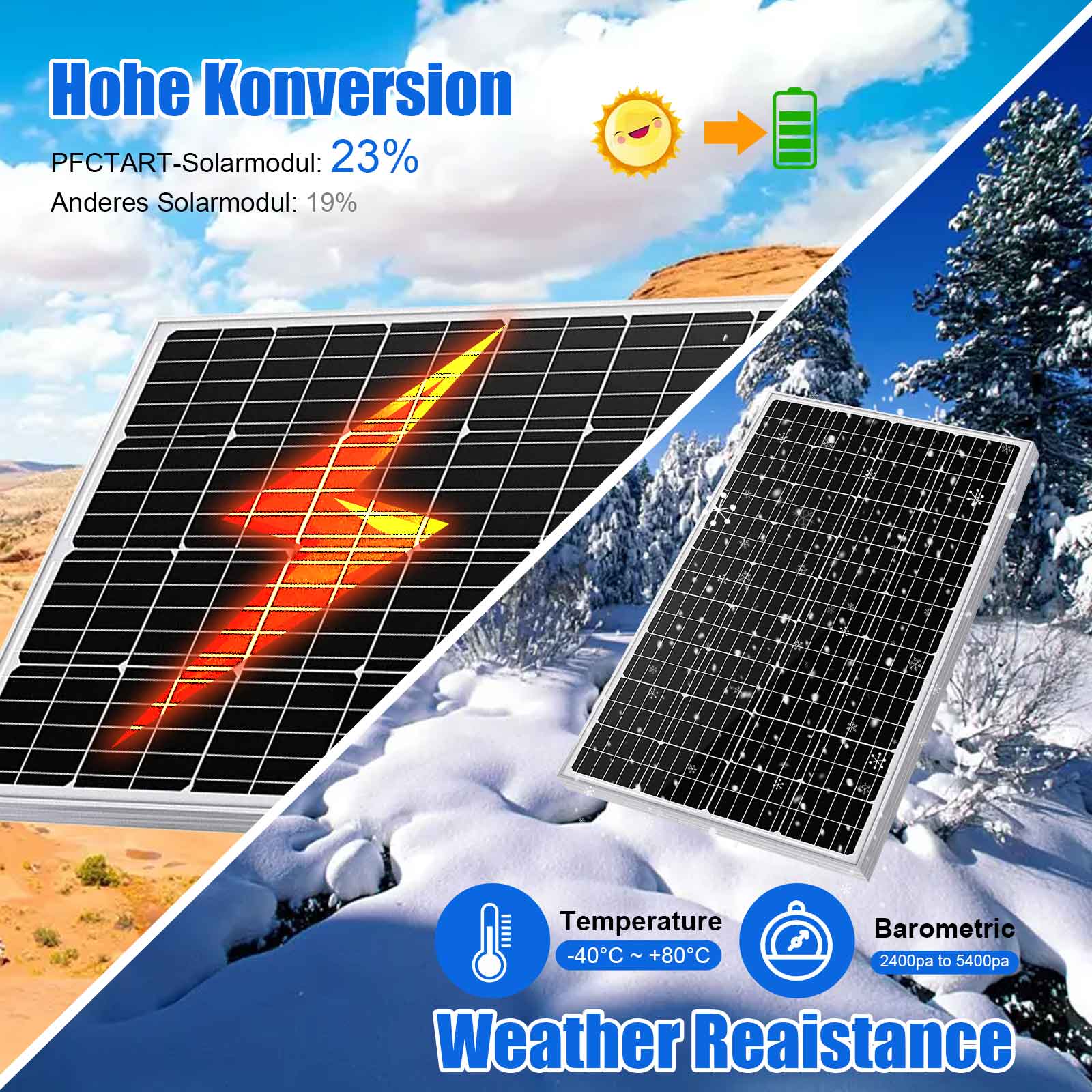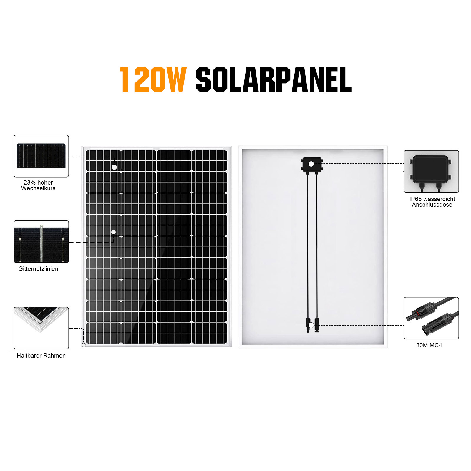 - Das Solarpanel besteht aus hocheffizienten monokristallinen Solarmodulen, einem hochbelastbaren Rahmen aus eloxiertem