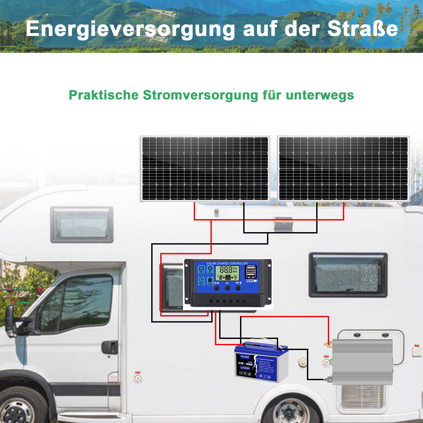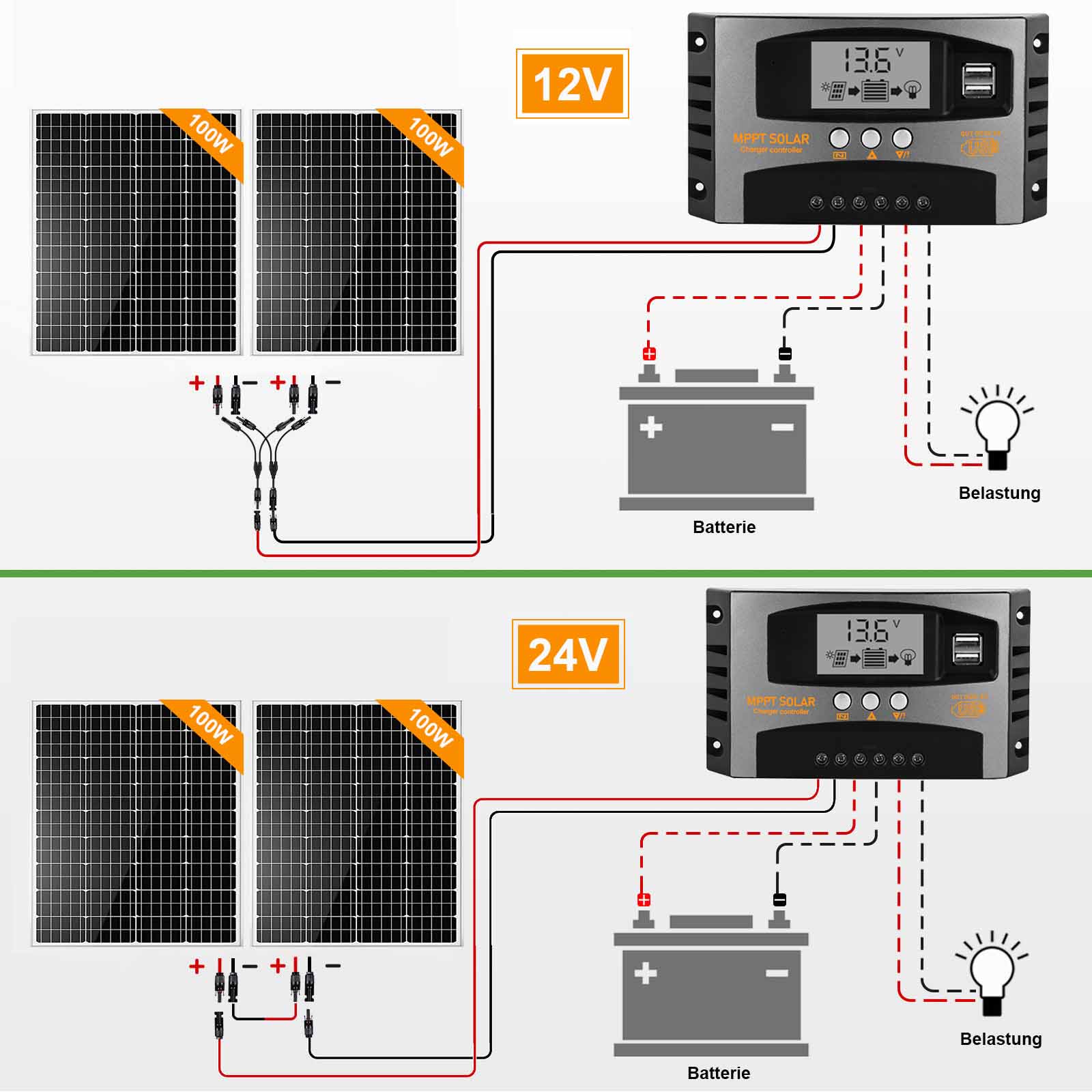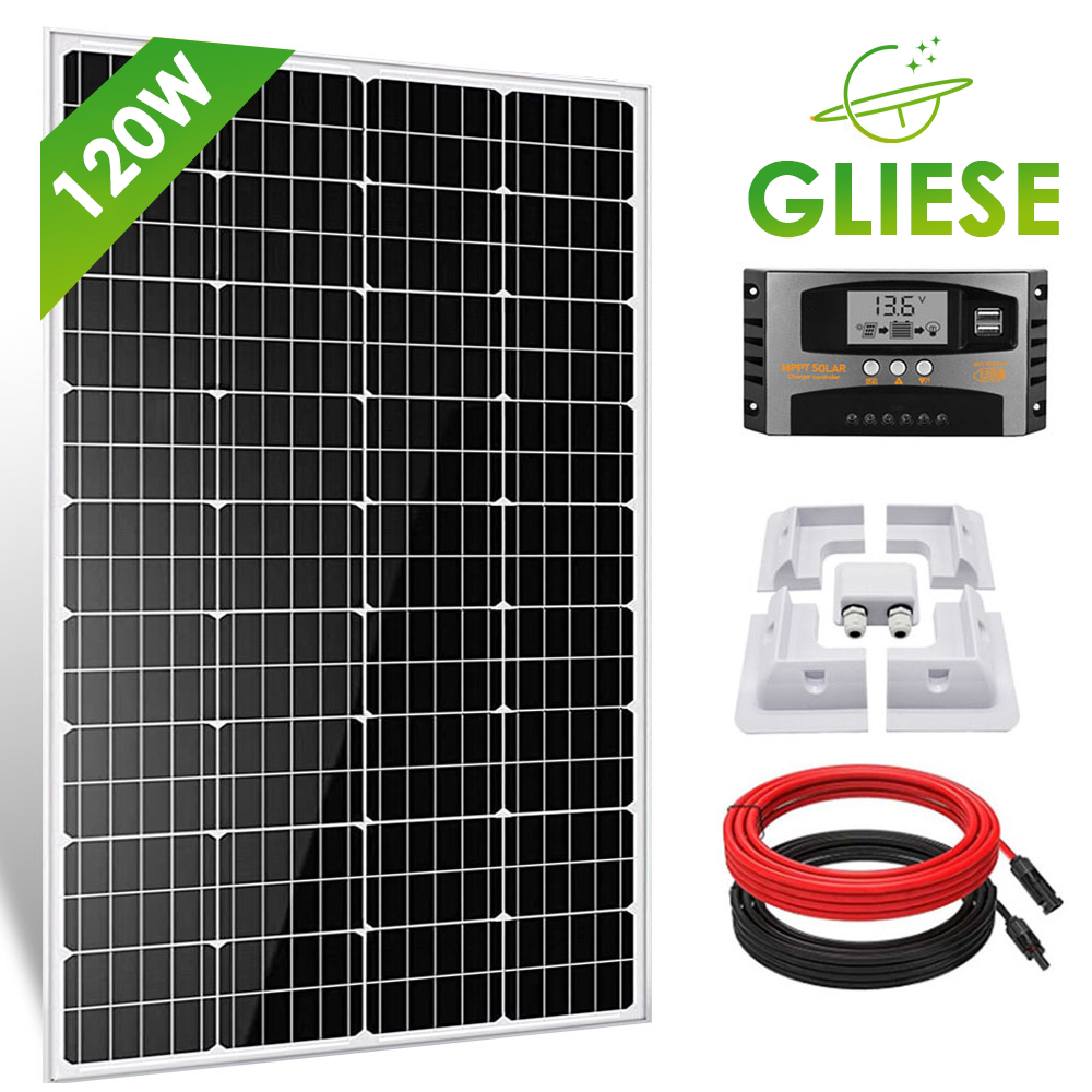 - Das Paket umfasst einen 120-Watt-18-Volt-Solarpanel, einen RV halterung für Montage, einen intelligenten 12-V-/24-V-Laderegler, 1 Paar 2 Meter Kabel mit MC4 connector und einen 1 Paar 1- bis 2-Y-Solarkabel für mehrere Solarmodule in Reihe oder parallel.