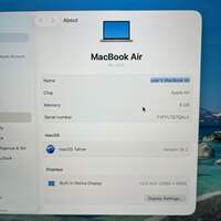 2020 Apple MacBook Air 13.3" M1 7C GPU 3.2GHz 8GB RAM 128GB SSD A2337 Items included in this sale: 2020 Apple MacBook Air 13.3" M1 7C GPU 3.2GHz 8GB RAM 128GB SSD A2337 *Please note, if it is not listed it is not included - such as power cables or other accessories. Specifications: Collection Apple Computers Sub-Collection Apple MacBook (M-Chip) Brand Apple Model MacBook Air MPN A2337 Release Year 2020 Processor Brand Apple Processor M1 Processor Cores 8C CPU Processor Speed 3.2GHz GPU (Cores) or Graphics Card 7C GPU Memory (Ram) 8GB RAM Storage 128GB Storage Type SSD Screen Size 13.3" Display Retina LCD Resolution 2560 x 1600 Retina Yes Touch Bar? Yes Fingerprint Sensor? Yes Bluetooth Yes Webcam Yes Microphone Yes WiFi Yes Color Silver Has Limited Warranty? No Apple Limited Warranty Has AppleCare+? No AppleCare+ Condition Good Operating System Tahoe 26.0 Connections 3.5mm Audio Jack Thunderbolt 3 (USB-C) Port Cycle Count 264 Battery Condition Normal Maximum Battery Capacity 85% UPC Serial# FVFFL7Q7Q6L6 Password password Cosmetic condition: The top is in good cosmetic condition with minimal wear. All four sides are in good cosmetic condition with minimal wear. All of the ports are in good condition and clean. The screen is in good condition with some minor wear and scuffs. The keyboard is in good condition with some minor wear and signs of use. The hinges are in good condition, sturdy and functioning properly. The bezel is in good cosmetic condition with little to no wear. The bottom is in fair condition due to scuffs, dents, scratches and wear. Some of these scratches are semi-deep and easily seen. Please view our close up photos, as these are taken of the actual item being offered for sale. Functionality condition: The LCD is fully functional with no damage or issues. I was able to connect to a WiFi network and test the audio by playing a video. The WiFi and audio are both fully functional. The keyboard has been tested and all keys function properly. The touch functions have been tested and are fully functional.