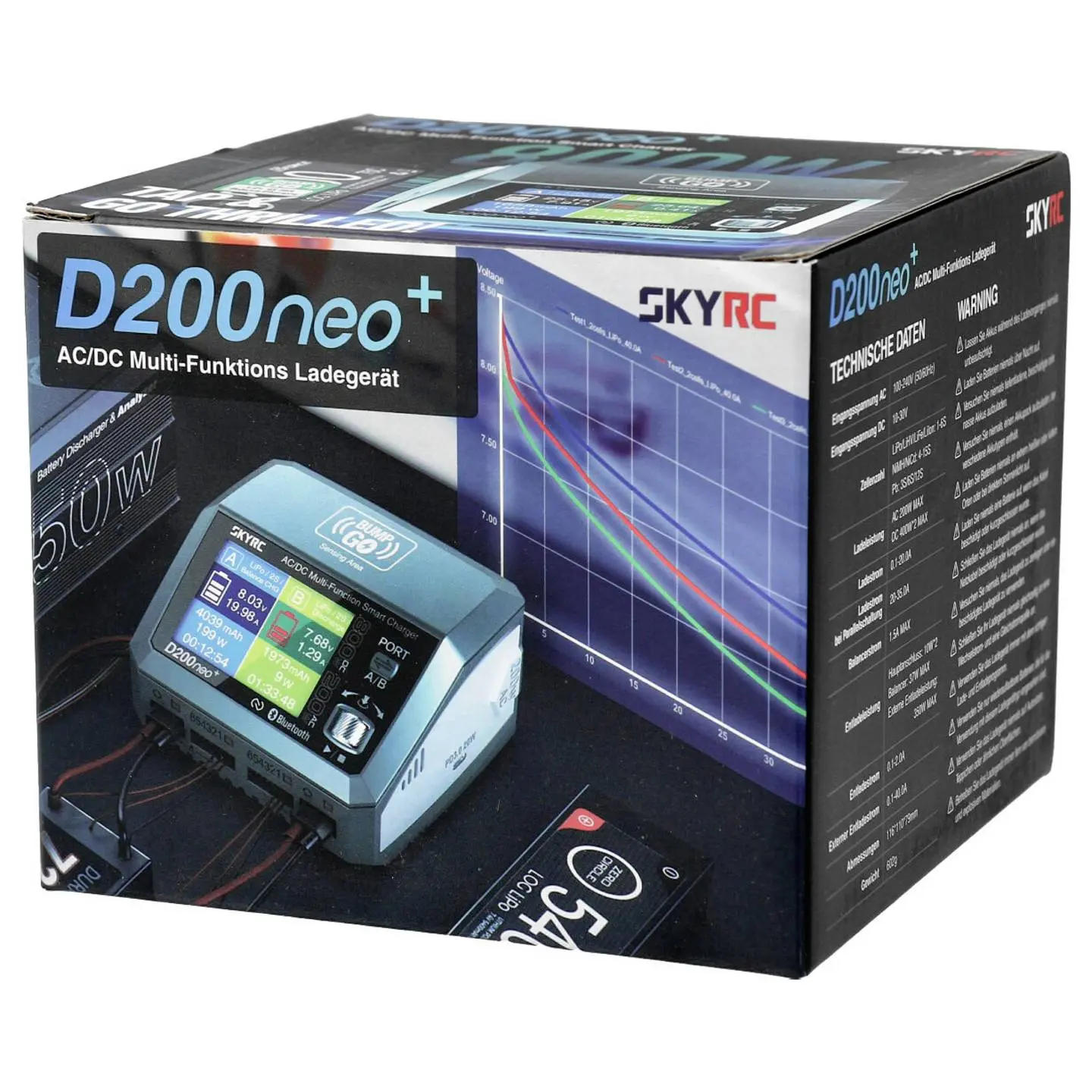 Das D200 neo+ AC/DC Multifunktions-Ladegerät ist mit NFC-Technologie ausgestattet und die aktualisierte Version des D200. Speziell für Modellflugzeuge entwickelt, bietet es zwei separate Ladeschnittstellen und unterstützt die meisten Akkutypen, die in der RC-Branche verwendet werden. Mit der neu hinzugefügten BumpGO-NFC-Technologie ist es möglich, ganze Ladevoreinstellungen auf einem kleinen NFC-Tag-Aufkleber abzuspeichern. Anschließend kann der Aufkleber am Akku aufgebracht werden und vor dem nächsten Laden reicht ein einfacher Scan an der Oberseite und schon kann es losgehen. Verabschieden Sie sich also davon, jedes Mal die Parameter neu einstellen zu müssen. Aufgrund der zwei voneinander unabhängigen Eingänge kann das Ladegerät für die verschiedensten Ladesituationen verwendet werden. Zudem verfügt es über eine besonders benutzerfreundliche Oberfläche und leistungsstarke Funktionen, die direkt vom T1000 übernommen wurden. Beispielsweise kann so auch die Entladeeinheit BD350 angeschlossen werden, um die Entladeleistung deutlich zu erhöhen. Das neue Erscheinungsbild und die verbesserte Scroll-Button-Steuerung machen das Aufladen rundum bequemer und einfacher. Natürlich ist das D200 neo aber auch wieder mit der "SkyCharger" App-Steuerung und einer Schnittstelle für die Charger Master-Software für Windows/Mac OS versehen. Das bedeutet also mehr Freiheit beim Programmieren und detaillierte Information beim Auf- bzw. Entladen.