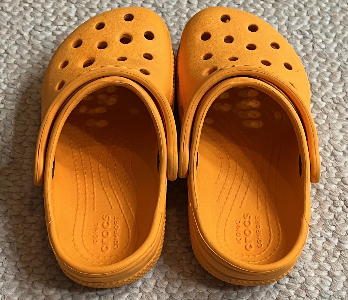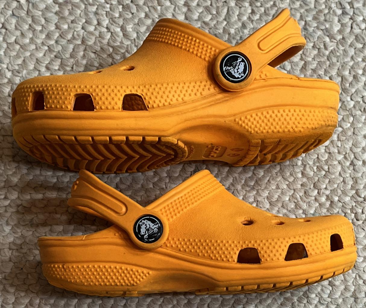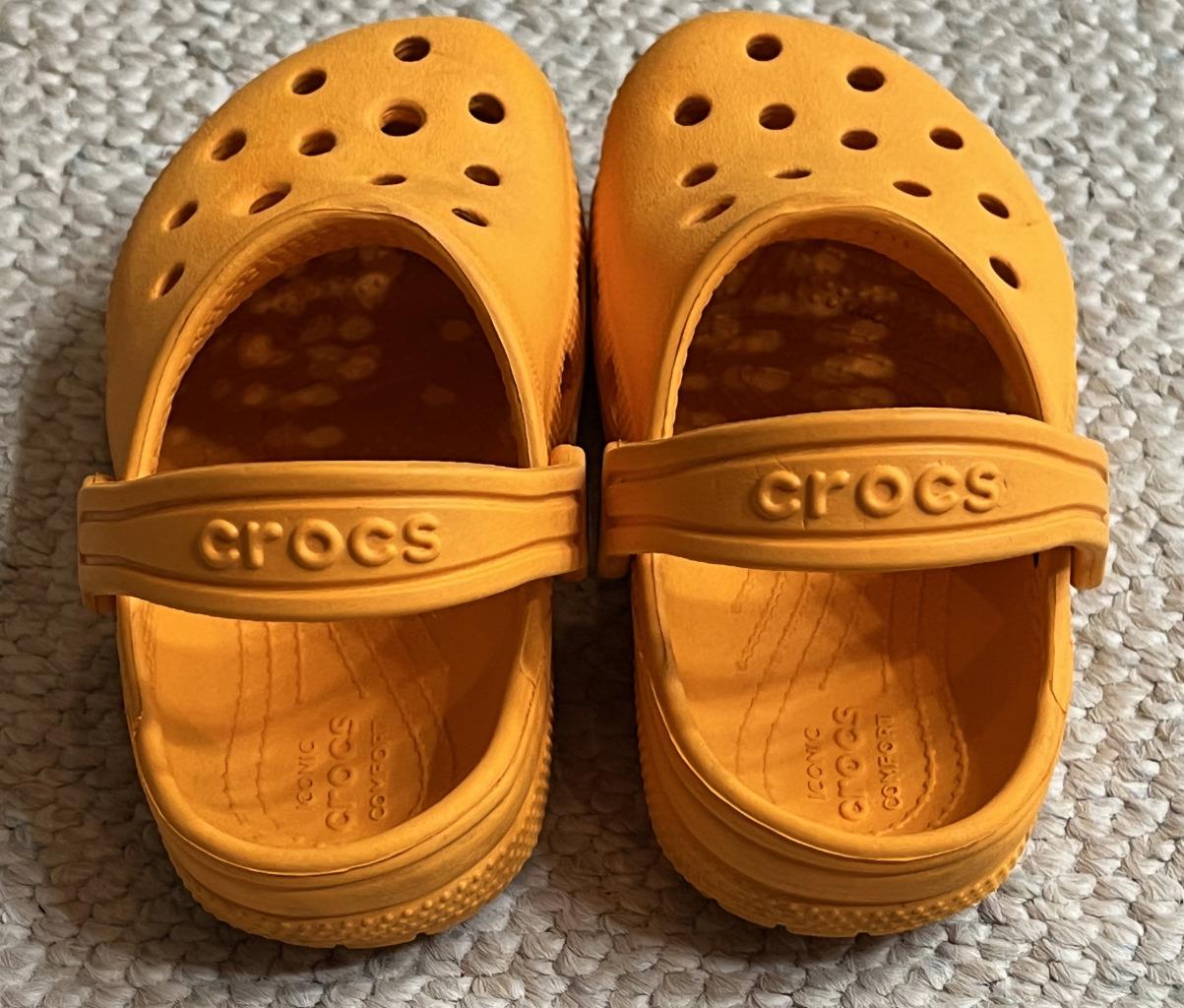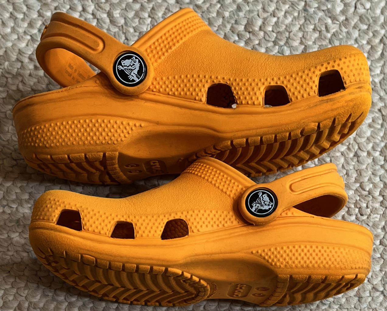 Crocs Classics sandals in Unisex Neutral Boy or Girl size 10C Child. Color is orange. Slip on with adjustable hook and look straps.