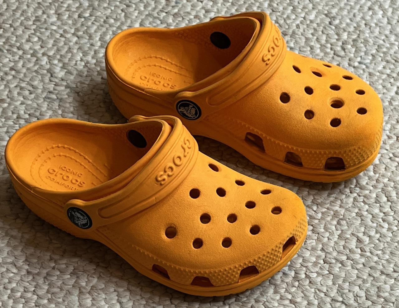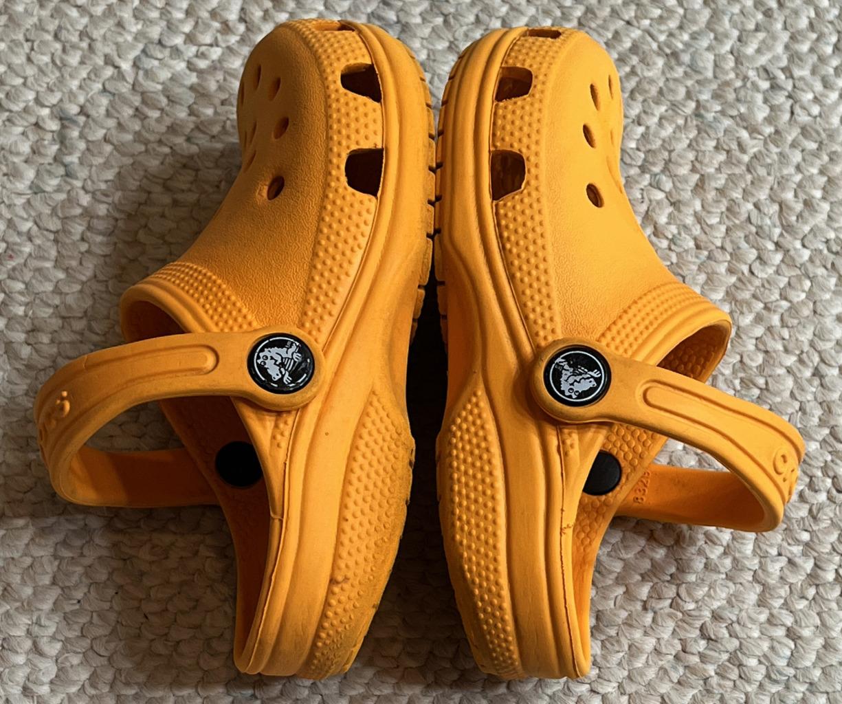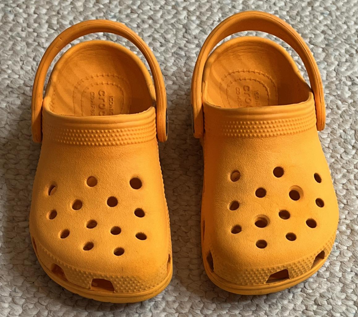 Crocs Classics sandals in Unisex Neutral Boy or Girl size 10C Child. Color is orange. Slip on with adjustable hook and look straps.