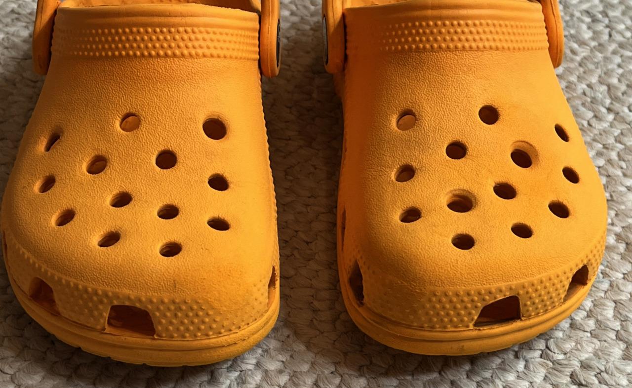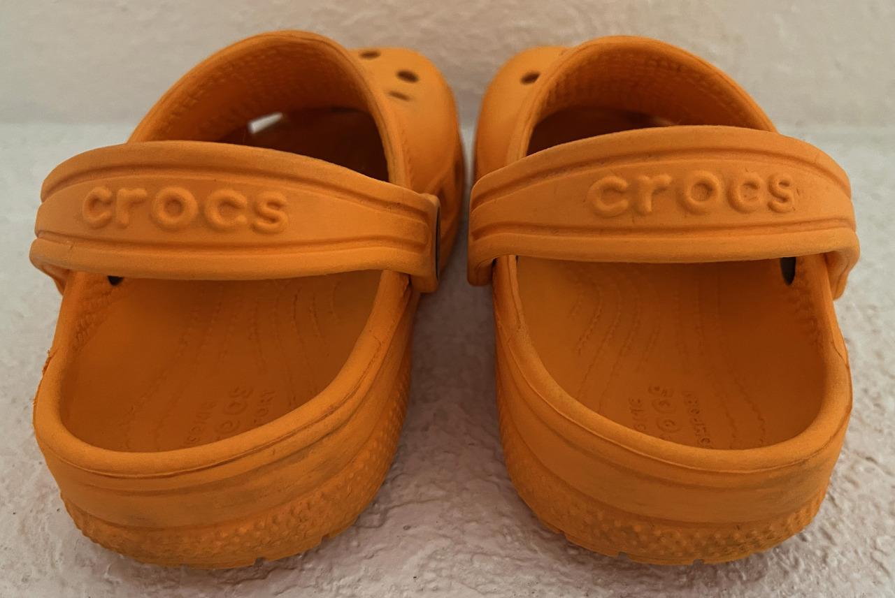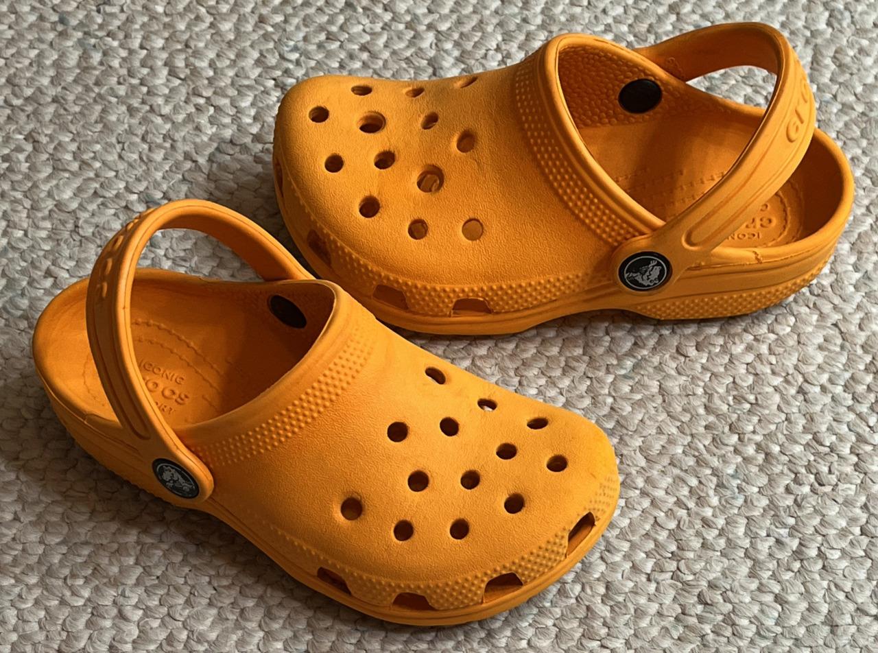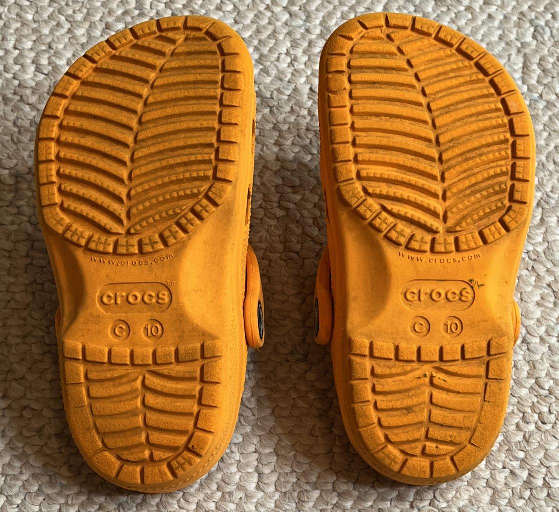 Crocs Classics sandals in Unisex Neutral Boy or Girl size 10C Child. Color is orange. Slip on with adjustable hook and look straps.