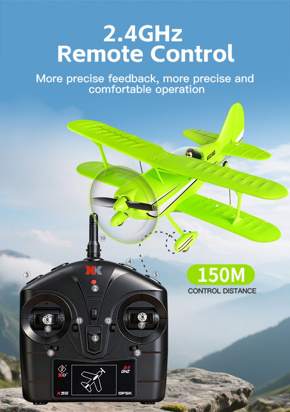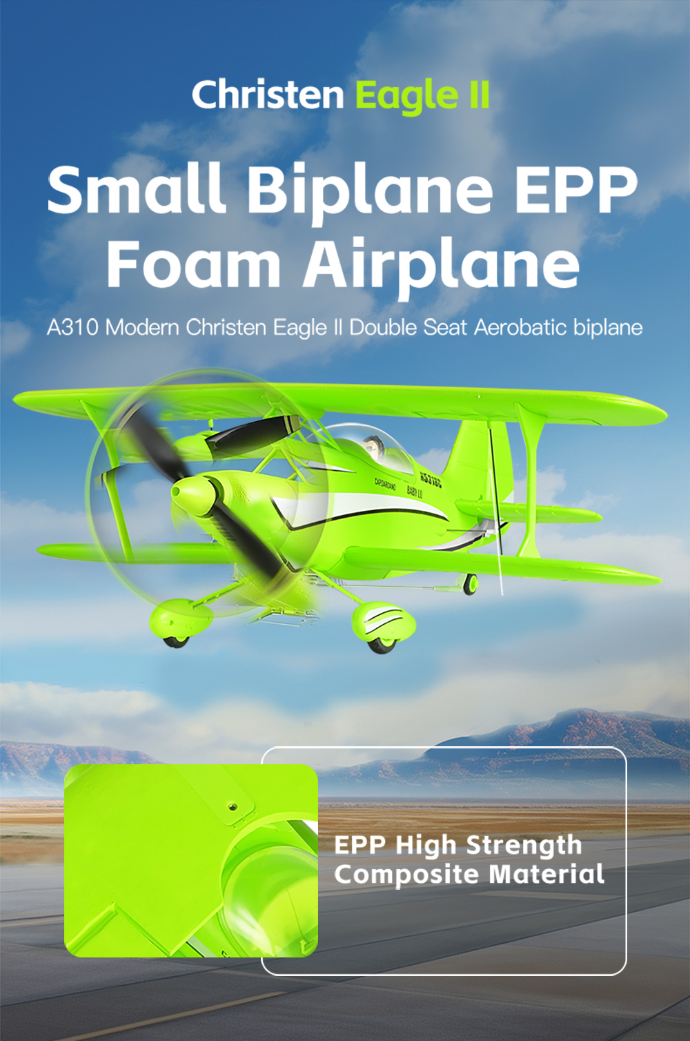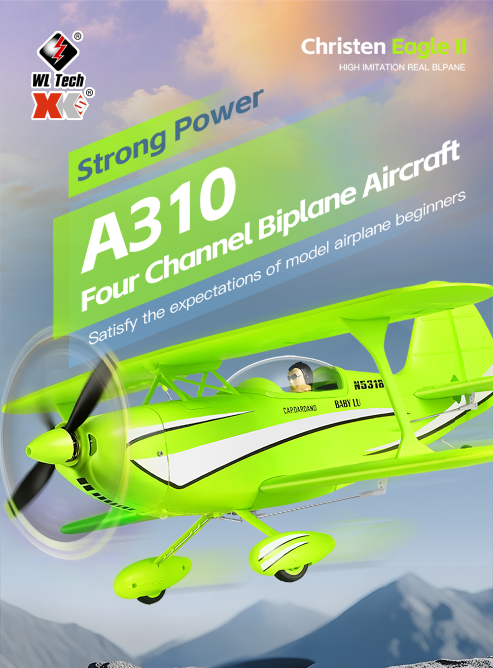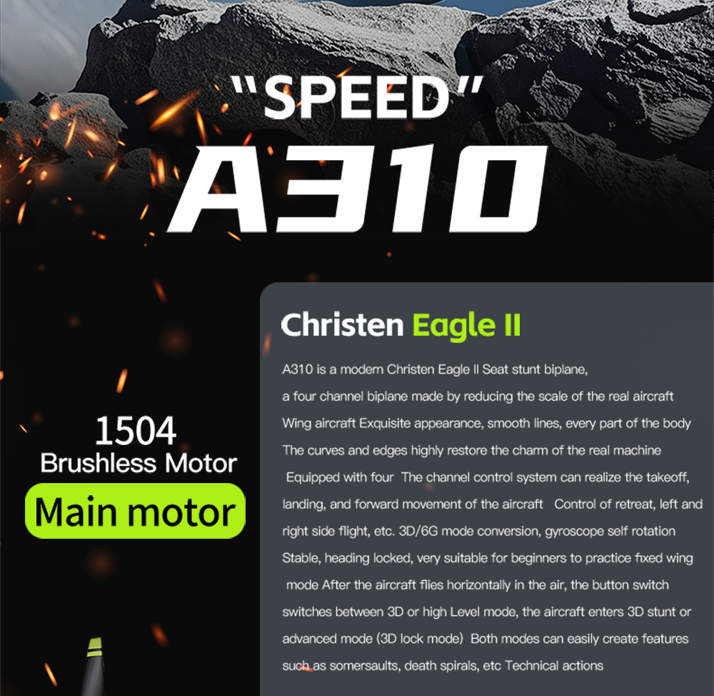 The A310 RC biplane aircraft is a realistic WWII-style model featuring a 3D/6G dual flight system, brushless power, and durable EPP construction, designed for both beginner training and advanced aerobatic outdoor flying.