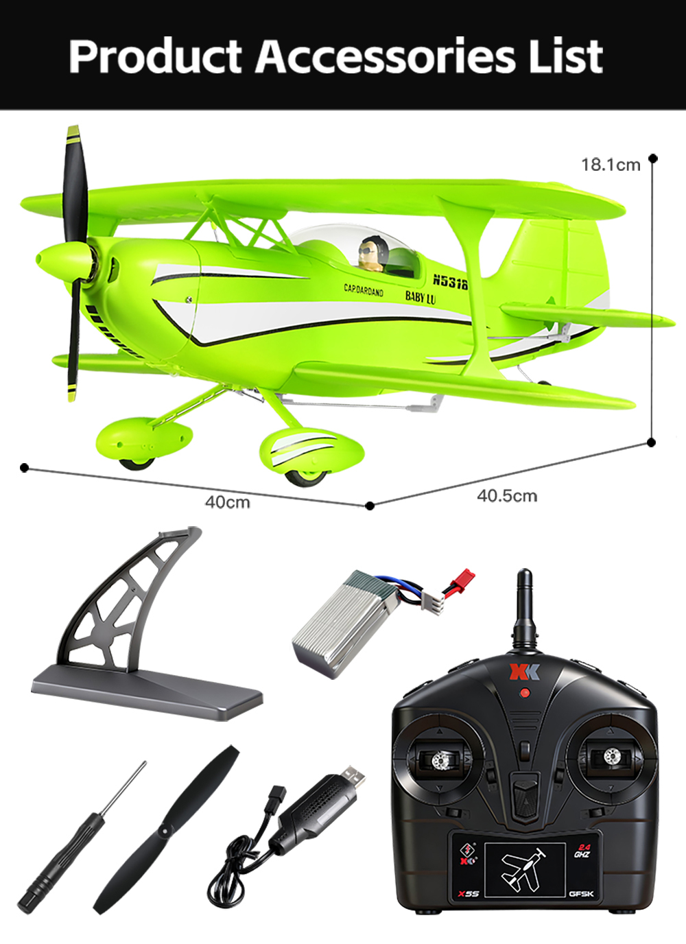 Wingspan × Length × Height: 40 × 40.5 × 18.1 cm