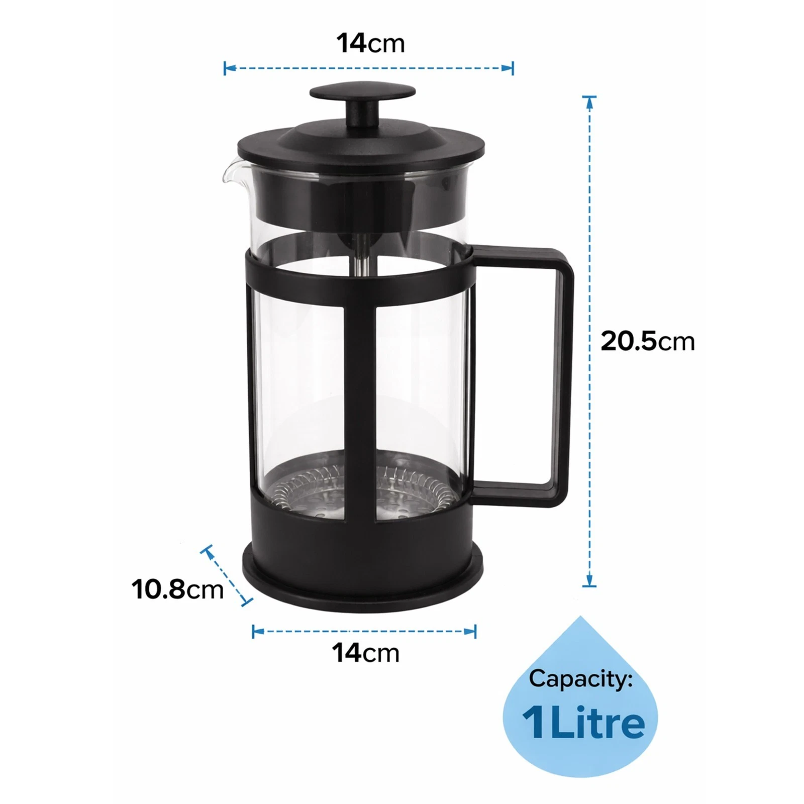 This French Press Coffee Maker is available in 2 DIFFERENT COLOUR BLACK, and RED. DIMENTION ARE – Length:14cm, Width:10.8cm, Height:20.5cm, and Capacity:1Litre. NOTE – ONLY ONE OF YOUR CHOSEN SIZE SHALL BE SENT OUT. This is Dishwasher safe.Perfect Tea & Coffee Maker – Brew rich, aromatic coffee or loose-leaf tea with this classic French press coffee plunger. Ideal for home kitchens, offices, cafés, and coffee lovers. Easy Manual Brewing – Simple French press mechanism allows you to brew smooth coffee in just minutes. Enjoy full-flavour coffee without the need for electricity. Durable Glass & Filter System – Features a clear glass beaker and stainless-steel plunger filter that separates coffee grounds or tea leaves for a clean, smooth drink. Easy to Clean & Maintain – The plunger mechanism can be easily removed for cleaning. Hand wash with warm soapy water or place in the dishwasher for convenience.