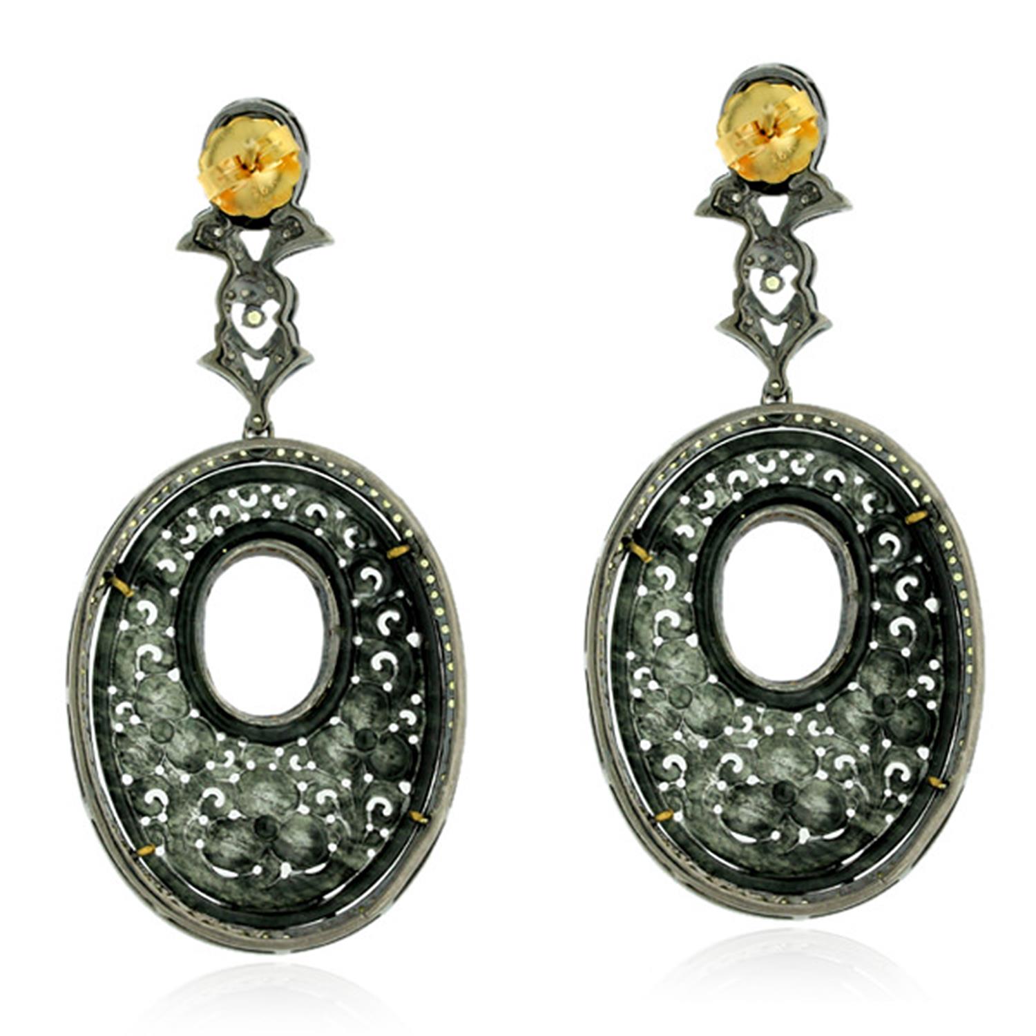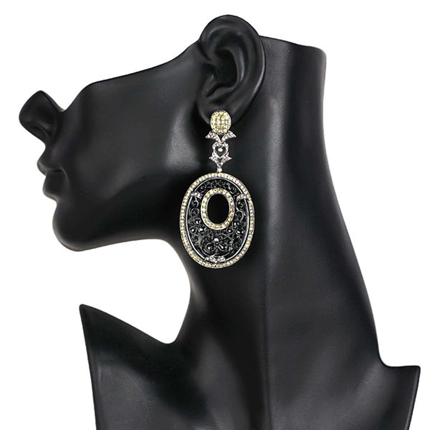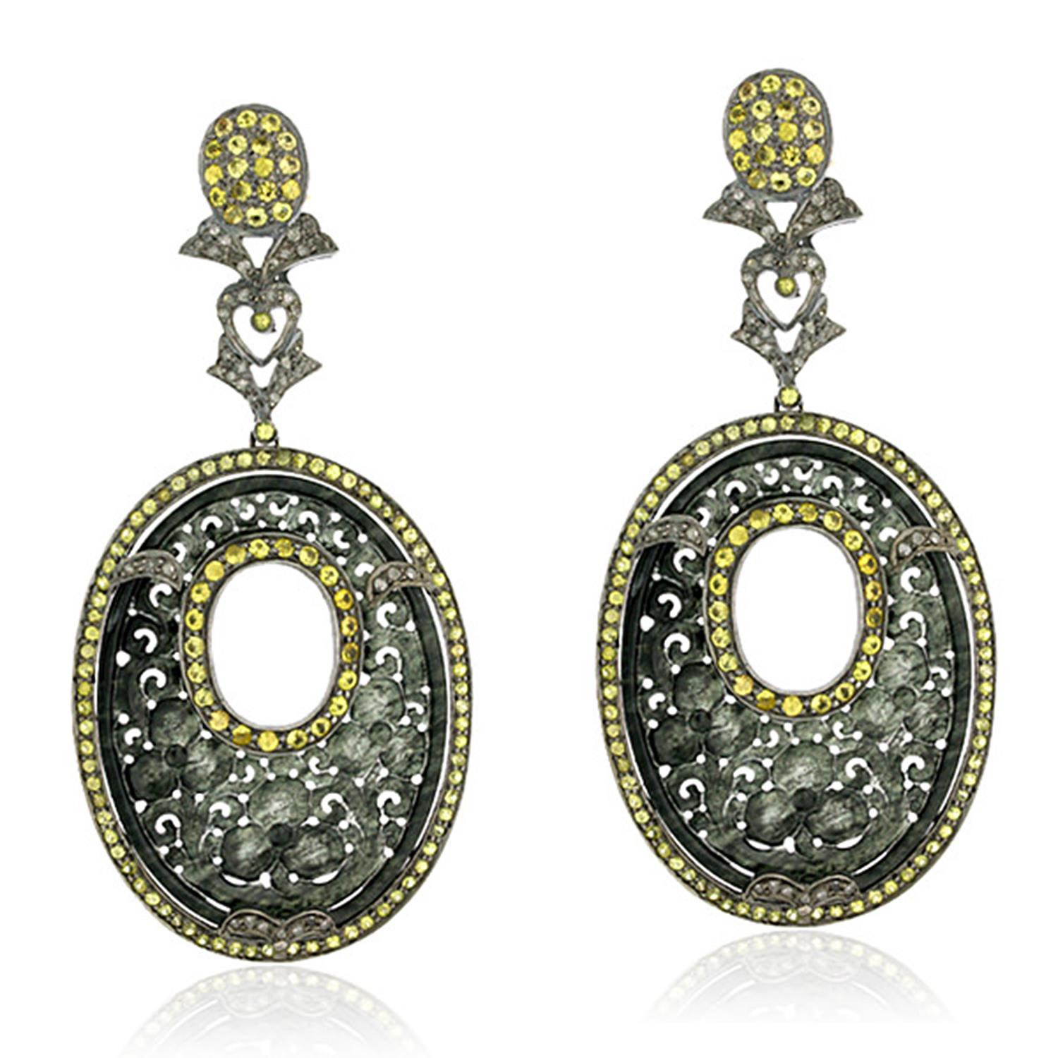31.7ct Carved Jade Yellow Sapphire Oxidized Oval Dangle Earrings 925 Silver