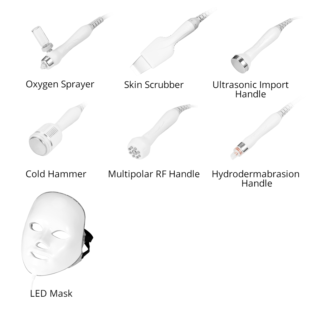 Probe1*Cold Hammer1*Hydro Water Facial Probe7*Hydro Water Facial Probe Head1*Spray Gun1*LED Mask1*Power Line1*User Manual1 set of Aqua Peeling Solution