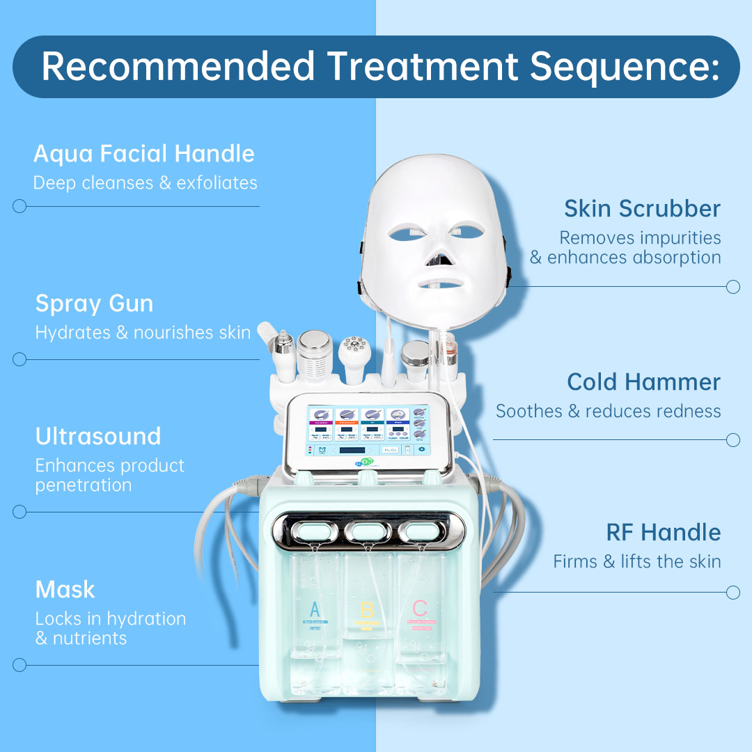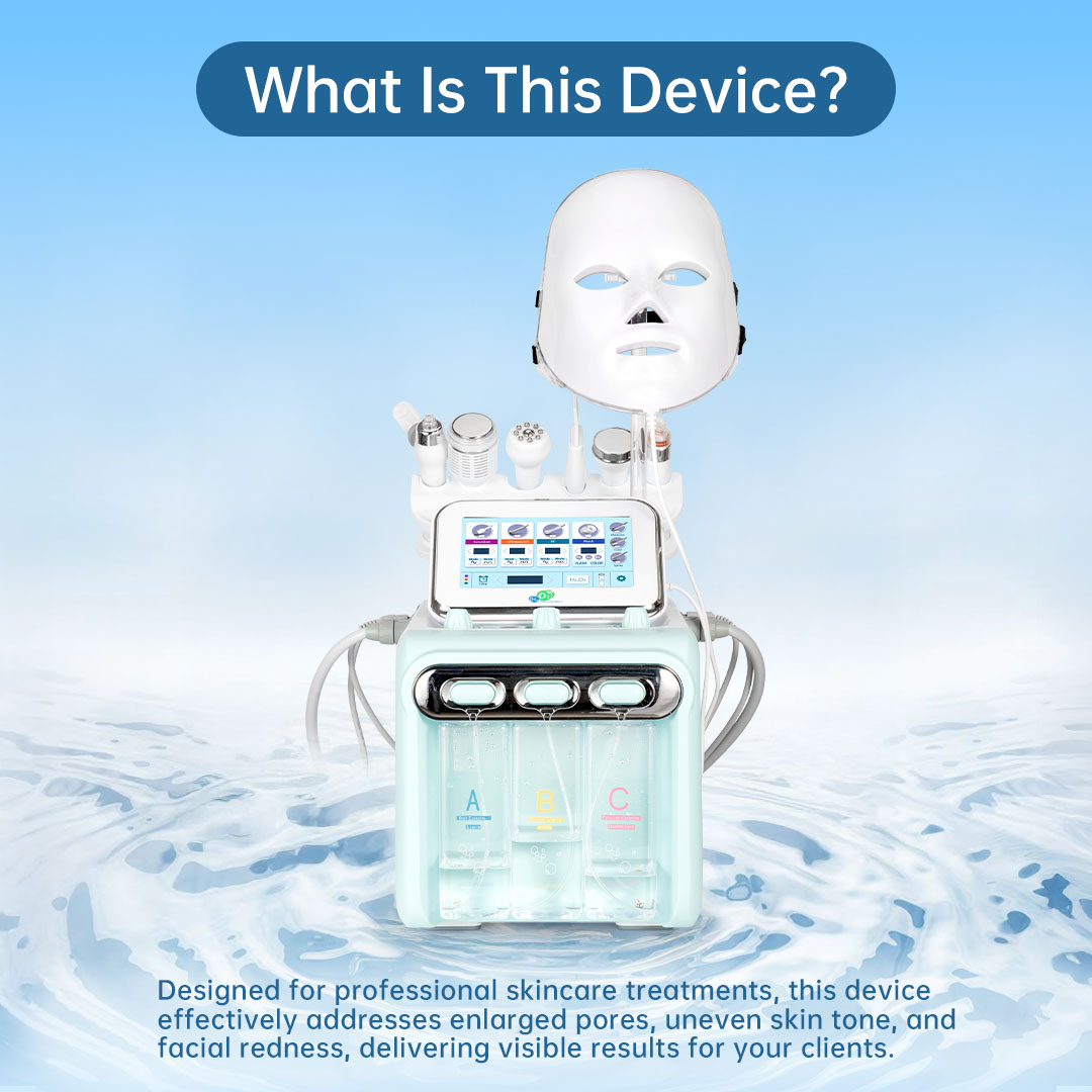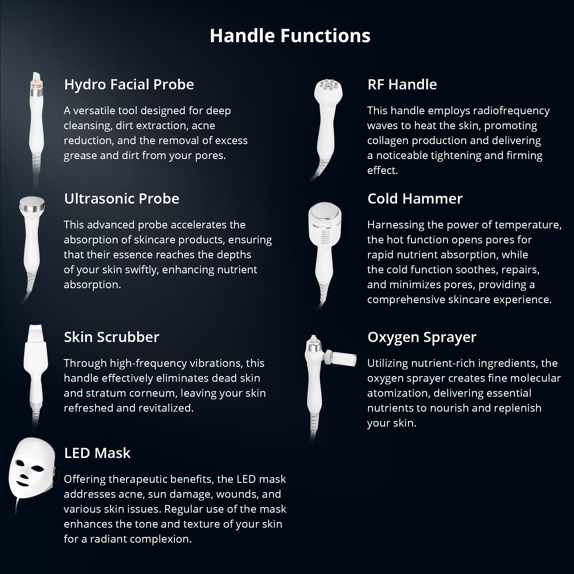 Our professional skincare device is equipped with 6 handpieces and 1 mask. Tailored to address various skin issues such as acne, fine lines, and enlarged pores, it offers a targeted solution, ensuring a comprehensive skincare experience.