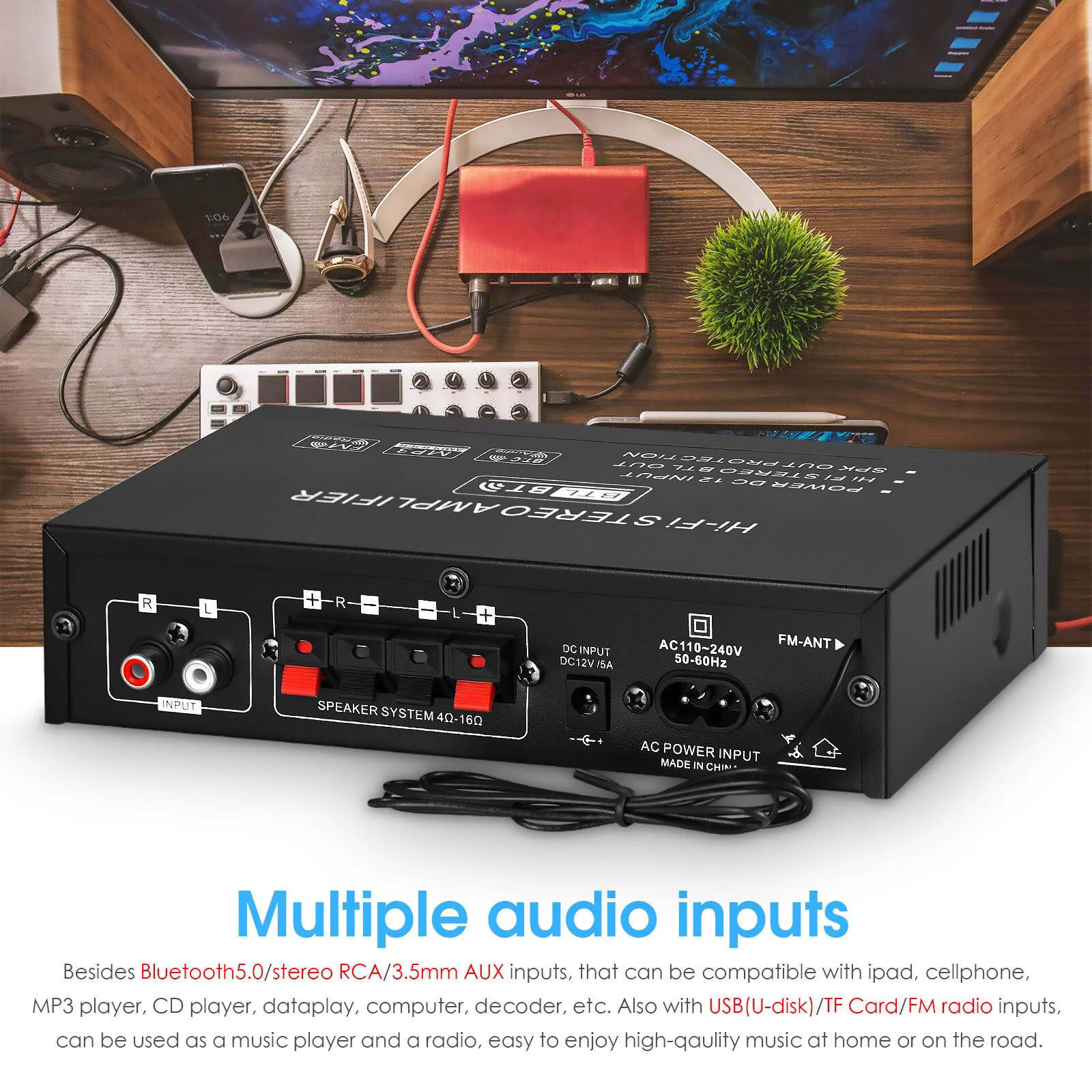 Multiple audio inputs: besides Bluetooth5.0/stereo RCA/3.5mm AUX inputs, that can be compatible with ipad, cellphone, MP3 player, CD player, dataplay, computer, decoder, etc. Also with USB(U-disk)/TF Card/FM radio inputs, can be used as a music player and a radio, easy to enjoy high-qaulity music at home or on the road.