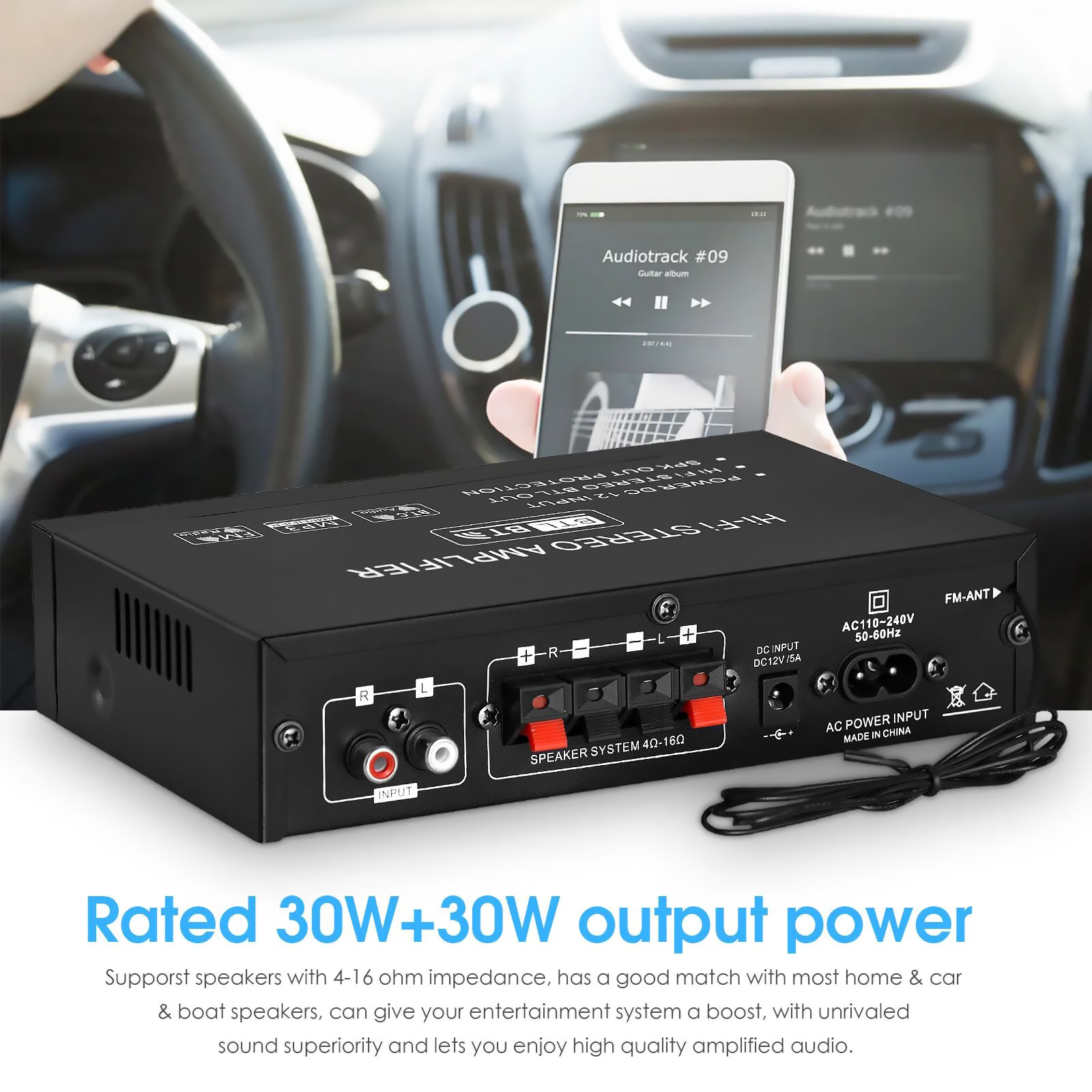 Rated 30W+30W output power: supporst speakers with 4-16 ohm impedance, has a good match with most home & car & boat speakers, can give your entertainment system a boost, with unrivaled sound superiority and lets you enjoy high quality amplified audio.