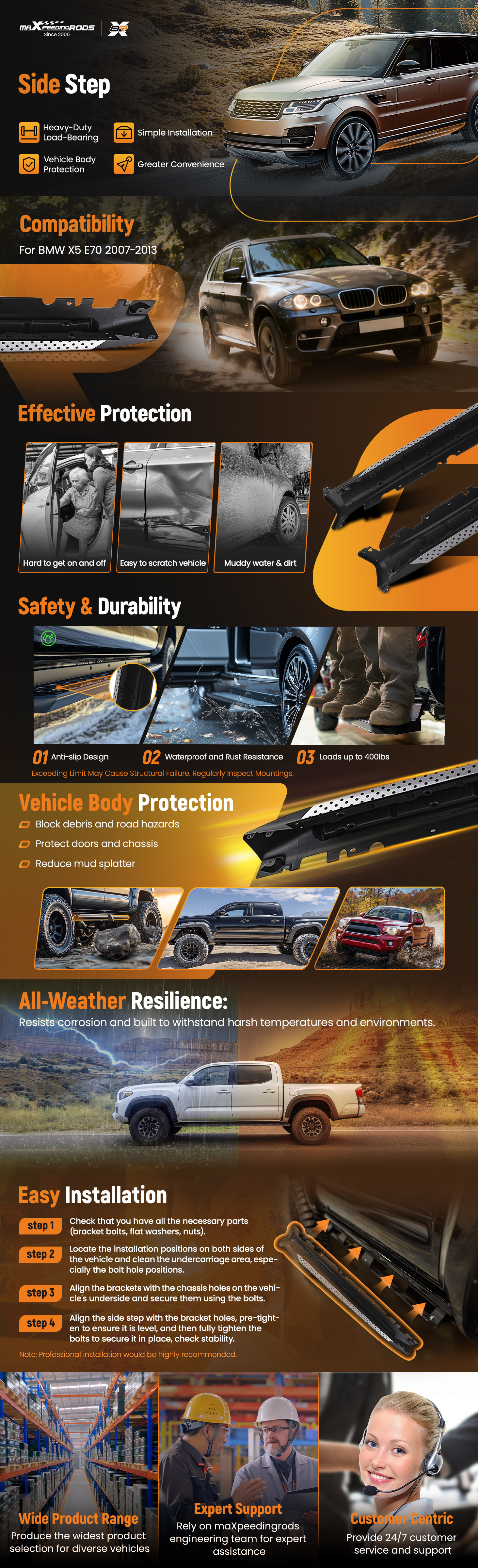 No more climbing struggles! Designed for effortless access, especially for kids, elderly passengers, or lifted trucks. Adds an extra layer of side protection against road debris and minor impacts.