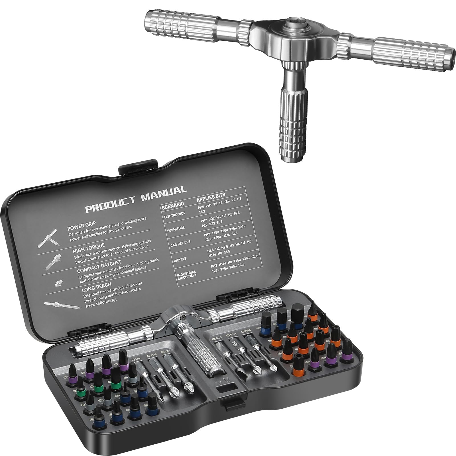 Features: This 38-in-1 precision screwdriver set is designed for everyday fixes, tech enthusiasts, and professional repairers alike. From assembling furniture to repairing electronics or maintaining your car, it provides the right bit, torque, and reach for every task. The 58-tooth ratcheting system offers 50N·m torque with a 6.2° swing arc, letting you tighten and loosen screws smoothly without straining your wrist. Paired with an ergonomic aluminum alloy T-handle, it ensures anti-slip comfort and reduced fatigue, even on extended projects. With its detachable extension bar, you can access tight or recessed screws that regular tools can’t reach. The smart magnetic system keeps every bit in place, while the built-in magnetizing zone makes screws stick exactly where you need them—no more accidental drops. Crafted from hardened steel, this screwdriver set is built for durability and stands up to both heavy-duty and precision tasks. Packaged in a compact, stylish case, it doubles as a thoughtful gift for DIYers, fathers, students, or professionals. Use it as a substitute for bulky toolboxes, or pair it with your drill or other repair kits for a complete solution. Whether at home, in the workshop, or on the go, this set delivers precision, convenience, and lasting value. User-Centered Design,implemented in Every Detail】From appearance to material, from material to tactile experiencefrom tactile experience to practicality, every aspect is ourcommitment to you. User-Friendly Color-Coding System. Color-Coded Wraparound Design for Bit Retrieval, Clear and Easy. Chromium-molybdenum alloy steel, CNC lathe milling one-time formingcarburizing and tempering heat treatment, industrial-grade durability.Magnet Groove Design. The handle has built-in strong magnets, which se Whatever you need】Whether you're a professional repair technician or a DIY enthusiast, this set is for furniture assembly, home appliances, computers, glasses, game consoles and other electronics.With our state-of-the-art equipment, you can solve the problems of assembly and repair For him】We believe that everyone needs a ratchet screwdriver kit to meet their travel and daily needs. Our ratchet screwdriver set is elegant and compact, perfect for him or anyone who enjoys home decor projects. Specifications: T-Handle Ratchet Wrench: Zinc alloy ratchet head with 3 aluminum alloy handles, durable and comfortable to grip. Bit Set (H1/4*25mm, manganese phosphate color-coded S2 steel): Phillips: PH0, PH1, PH2, PH3 Pozidriv: PZ1, PZ2, PZ3 Hex: H4-H1/4, H1.5, H2, H2.5, H3, H4, H5, H6, H8 Slotted: SL3, SL5, SL6 Torx: T6, T8H, T10H, T15H, T20H, T25H, T27H, T30H, T40H Special: S02, Y2, U6 Bit Set (H1/4*40mm, chrome-plated S2 steel): U4, PH0, PH1, PH2, PZ2, SL5 Extra Accessory: Built-in magnetizer/demagnetizer for quick magnetic adjustment, reducing dropped screws.