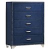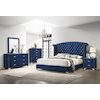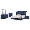 Accent your sleeping space like never before with this five-piece bedroom set. A dramatically large wingback headboard towers over the bed to make a grand display, featuring button tufting and nail head trim. A matching dresser comes equipped with six spacious drawers with nail head trim around the frame, coordinating with the matching mirror and five-drawer chest. The two-drawer nightstand is a must-have for storing bedside essentials. All pieces are upholstered in a luxurious velvet fabric.