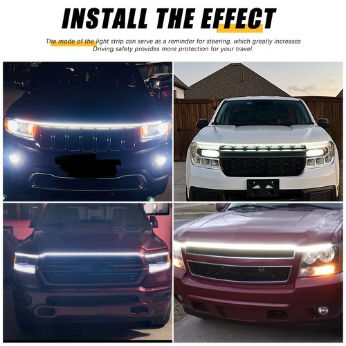【Dual Colors+Turn Signal Function】As running light,the hood light strip is White when driving,it is Sequential flowing yellow While turning Right/Left.It Synchronize with turn signal lamps.It can work as daytime running light,turn signal light