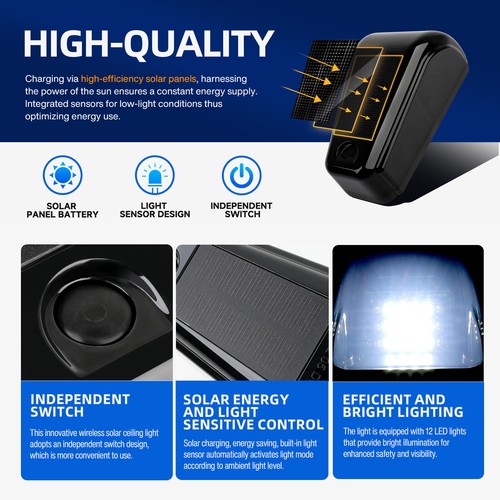 【Easy to Install】Just press the button at the bottom, cover the top and shake it gently, and after making sure the light turns on, tear off the double-sided tape at the bottom and install it on a flat place on the roof.