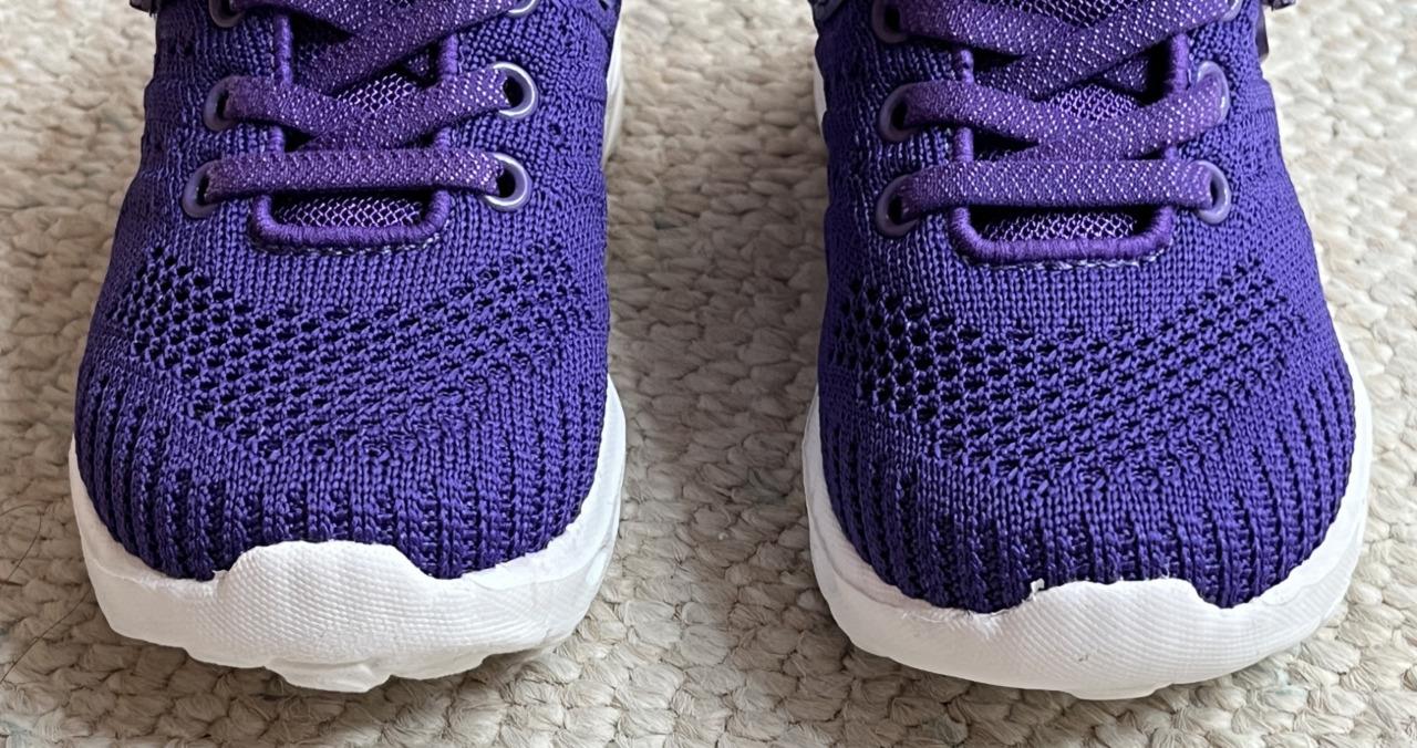 The color is purple/pink. Breathable mesh fabric, slip on with adjustable strap. No slip rubber sole. Cushioned interior and tongue for extra comfort.