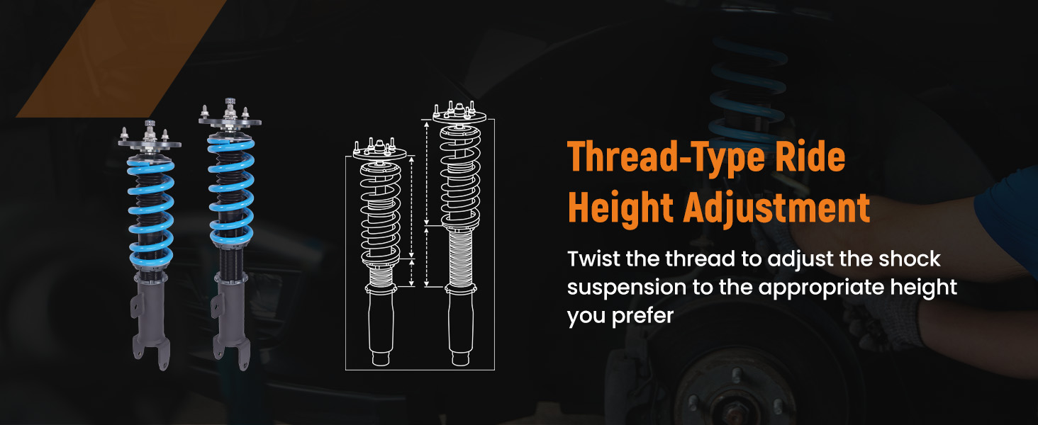 4. 24 Clicks of Rebound Adjustments -- This allows you the ability to perfectly dial in your coilovers system. For a nice comfortable driving, set damping to full soft. For more spirited driving, set it to 16 clicks. For occasional track days, set it to full stiff.
