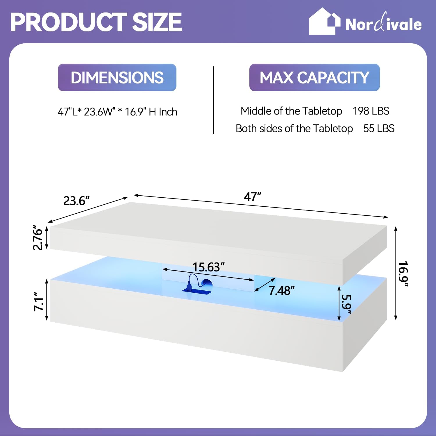 Charging Stat Design: There is charging stat including 1 USB port,1 type-c port and 2 power soets designed to offer much convenience for mobile devices charging. The white coffee table also conveys a sense of en to your room