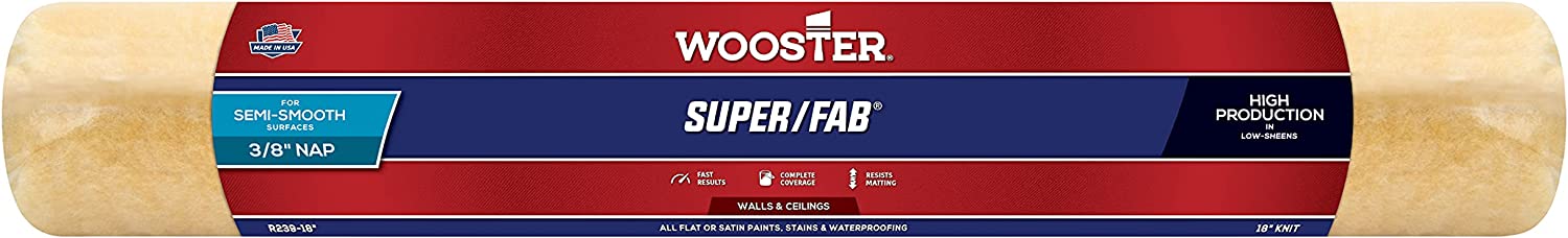 Includes (1) R239 18 inch Roller cover. 18" long roller cover with 3/8" Nap. Offers exceptional capacity with all flat, eggshell or satin paints, stains, waterproofing. Resists matting for complete coverage, smooth results. Green, double-thick polypropylene core resists water, solvents & cracking.