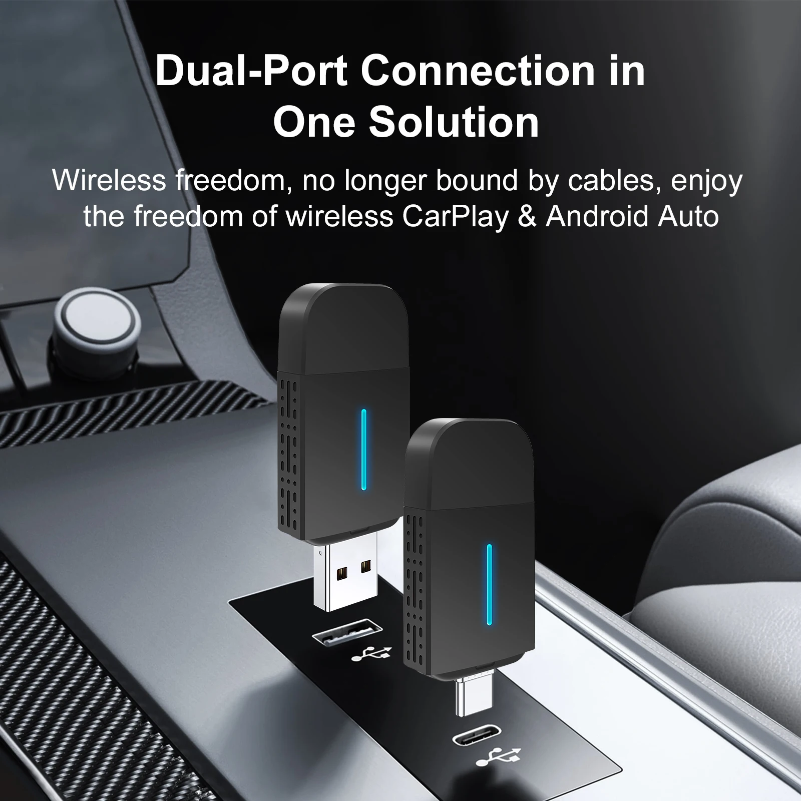 There are many CarPlay and Android car adapters on the market, each with its own limitations. We launched a 2-in-1 car adapter. Whether you are an Apple phone or an Android phone user, you can easily achieve perfect compatibility with just one product. No need to worry about various cables, our adapter is equipped with a USB port and a Type C port.