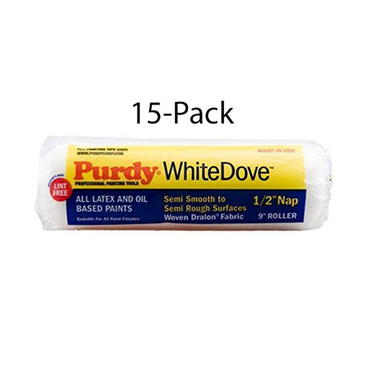Includes (15) Purdy WhiteDove Pro-Extra 9" x 1/2" Nap Roller Cover 140671093. Large core diameter version of Purdy's most popular roller covers holds 25-35% more paint – increases production. Use with all paints and exterior stains, especially where a smooth, lint free finish is desired. WhiteDove series features a high density woven cover, made of Dralon, a derivative of nylon, which enables the paint to flow freely into and out of the cover for easy rolling and a high quality finish. Made in the United States.