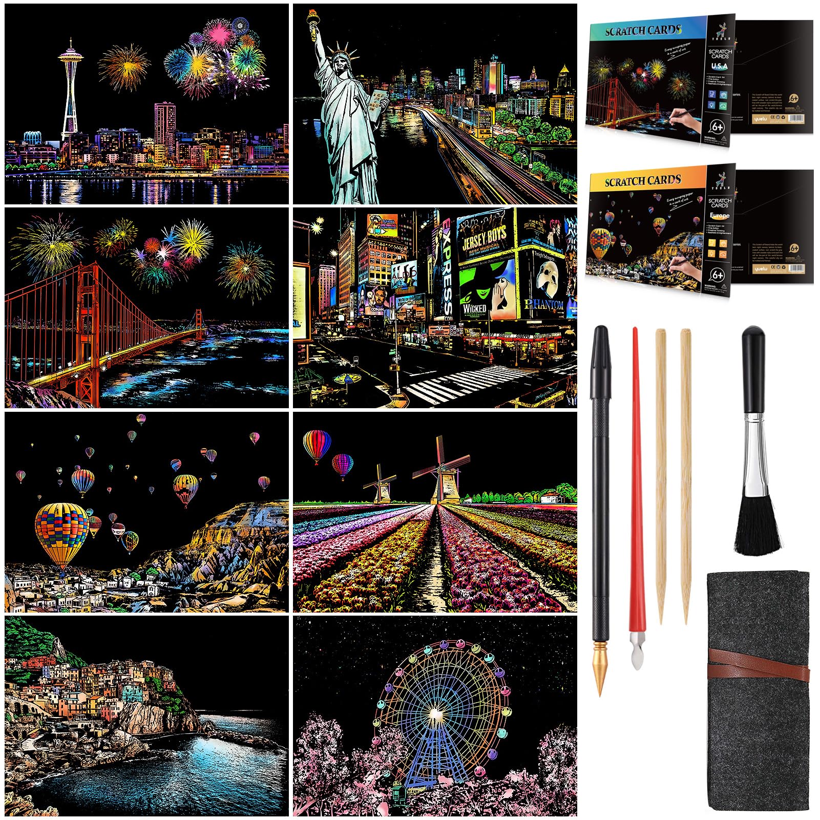 With Scratch Art, You Can:Relive cherished travel memories by sketching iconic cityscapes.Capture beautiful night views without needing a camera.Create unique gifts for travelers, explorers, and home decor enthusiasts.Enjoy relaxing, stress-relieving art therapy—no prior skill daily pressure and experience a sense of calm and accomplishment upon completing your artwork.Foster meaningful connection through shared creativity, making it a wonderful activity for parents and teens to enjoy together.Contents:8 x Scratch Drawing Boards(Featuring: Times Square New York / Seattle / Golden Gate Bridge / Statue of Liberty / Dutch Windmill / Sakura Ferris Wheel / Turkey / Italy)Scratch Art Paper Size:11.6 x 8.3 inches (A4)1 x Tool Bag(All tools neatly stored in one pouch)1 x Black Scratch Pen(Gold tip for outlines, fine tip for details)1 x Red Scraper(For smoothly scratching larger areas)1 x Clean Brush(To gently clear away scratched residue)2 x Wooden Stylus Sticks(For precise and easy scratching)Looking for the perfect creative gift?This beautifully designed Scratch Paper Art Set offers a clean, mess-free way to create—whether at home, in a workshop, or on the go.Suitable for teens and adults, this engraving art set encourages creativity, focus, and mindful expression. It's also a great take-along activity for trips, gatherings, or quiet moments outdoors.As a screen-free creative outlet, this set helps unlock imagination and provides a hands-on, engaging experience for anyone who loves to create.