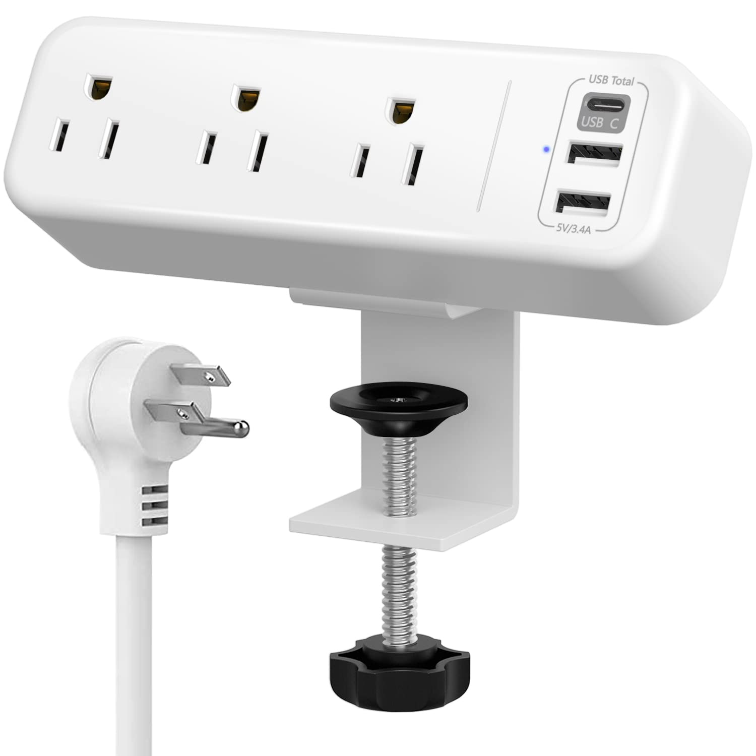 Desk Clamp Power Strip with USB C, 3 Outlets Desktop Mount Power Station with 6.5 ft Plug Extension Cord, White