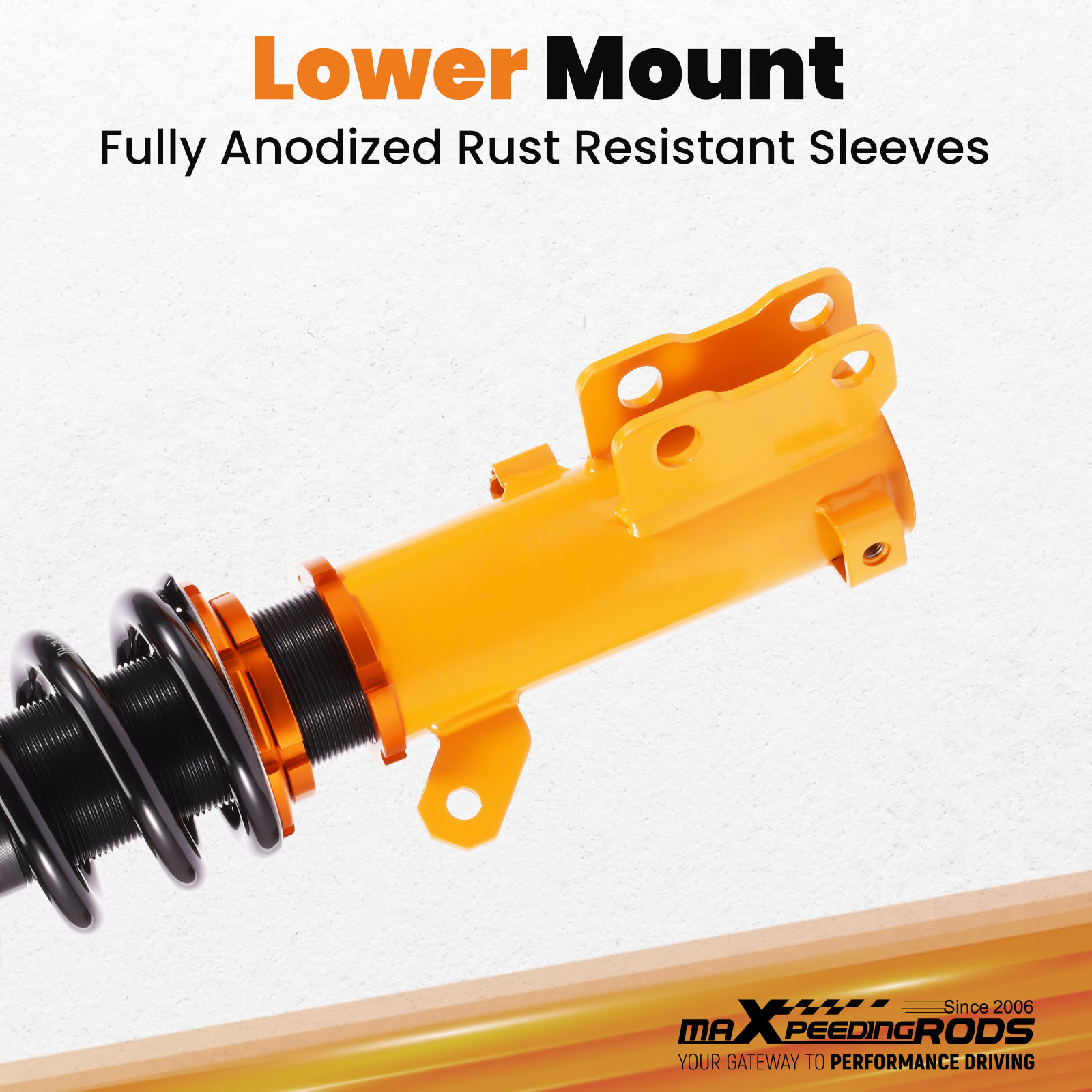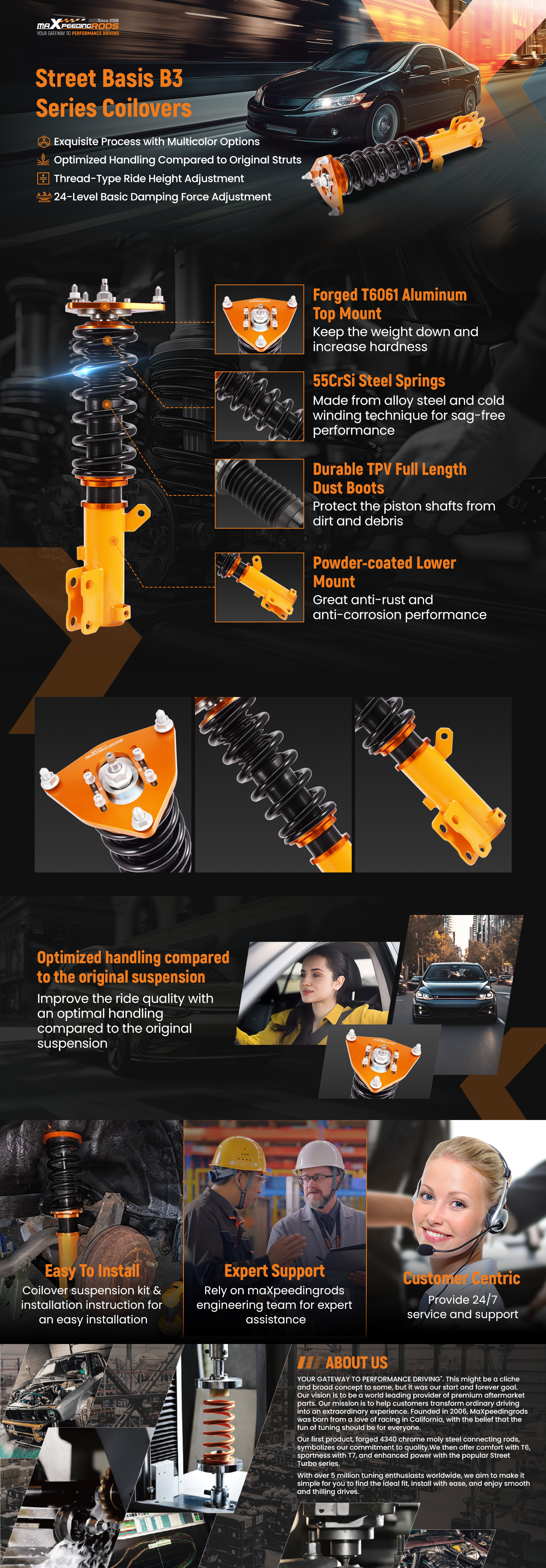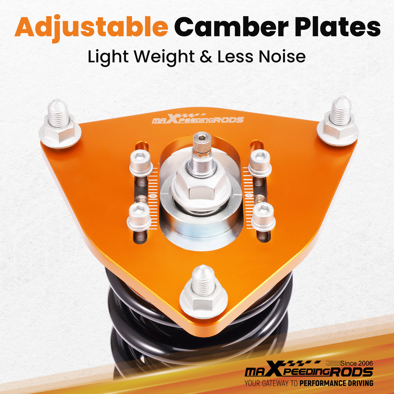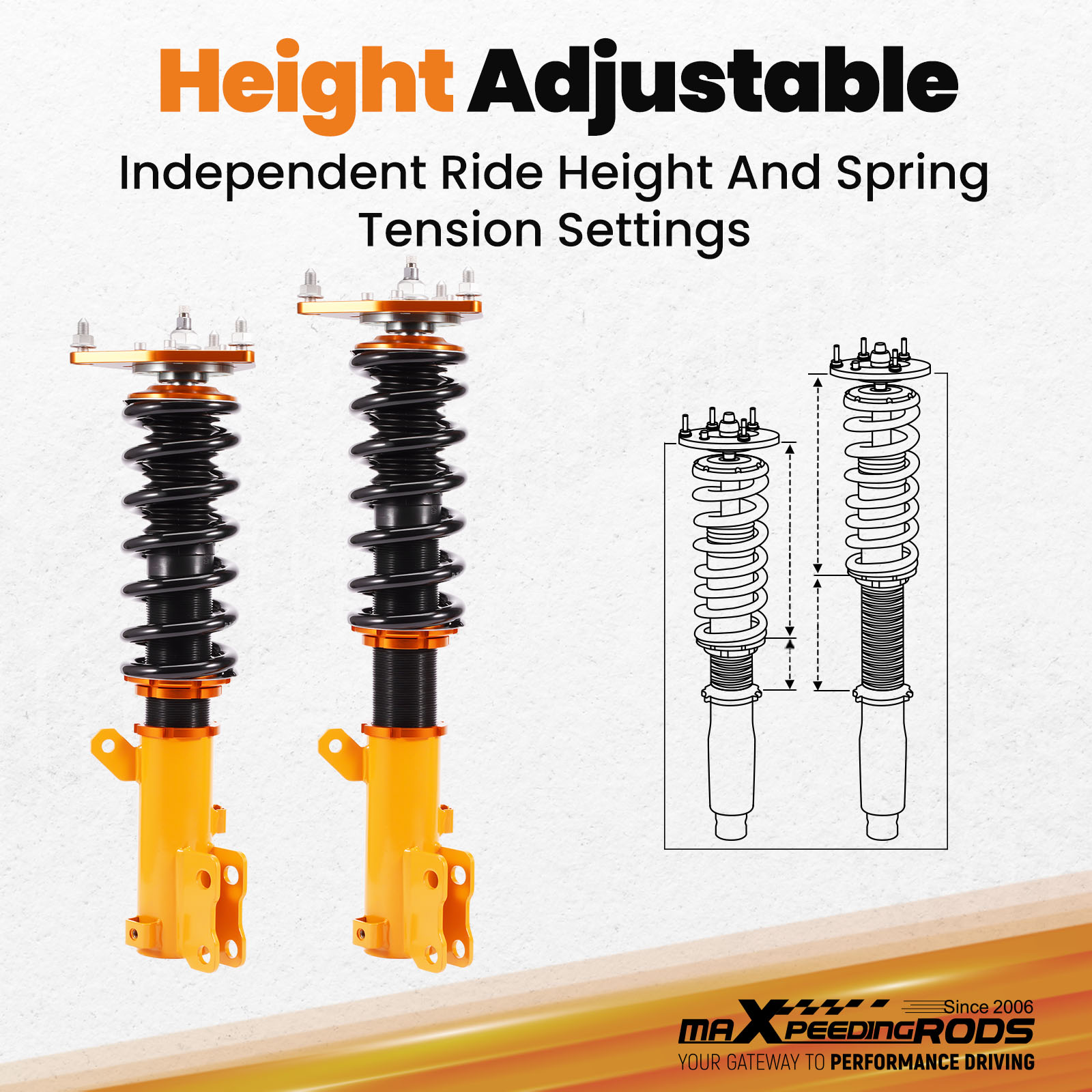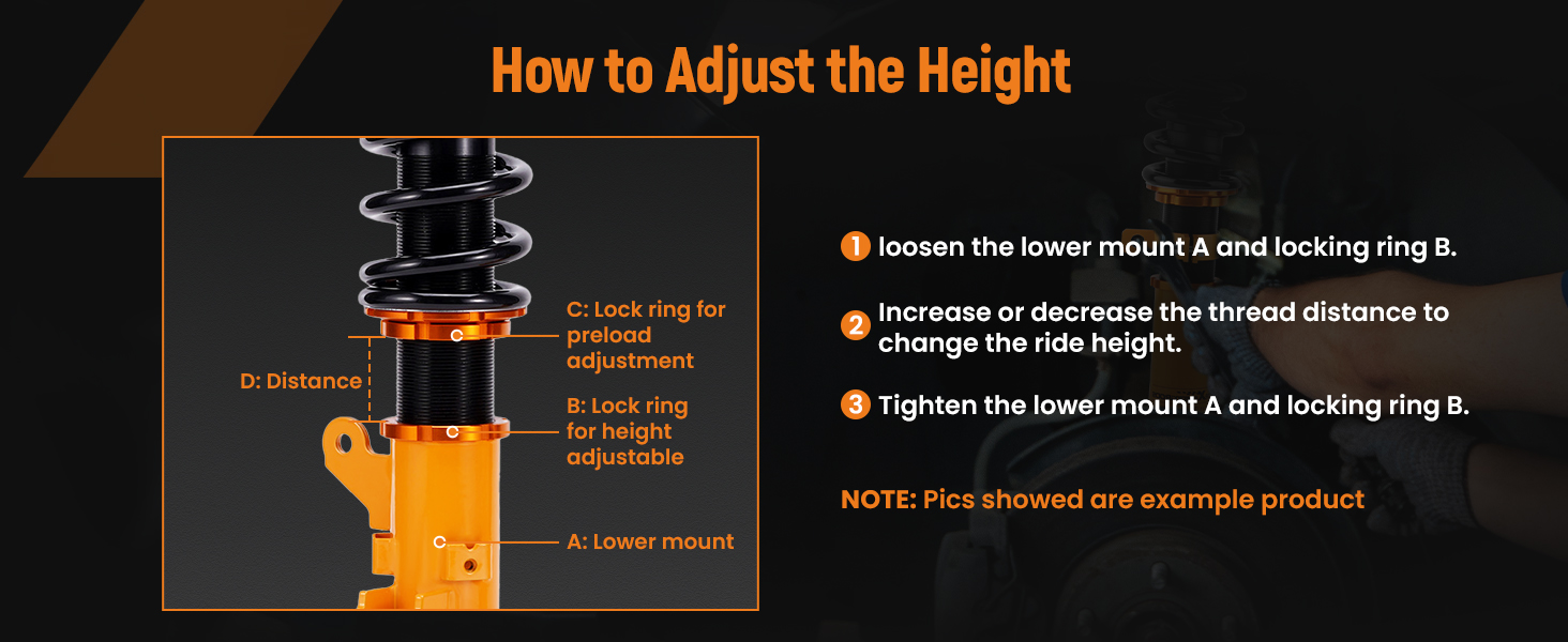 - Reinforced Rubber Bushing Upper Mount: Specifically designed for each vehicle, enhances silence and comfort. Adjustable camber angle for certain strut mechanism suspension cars. Full Length Adjustable Type: Allows ride height adjustment without affecting suspension stroke, maintaining comfort while customizing height.