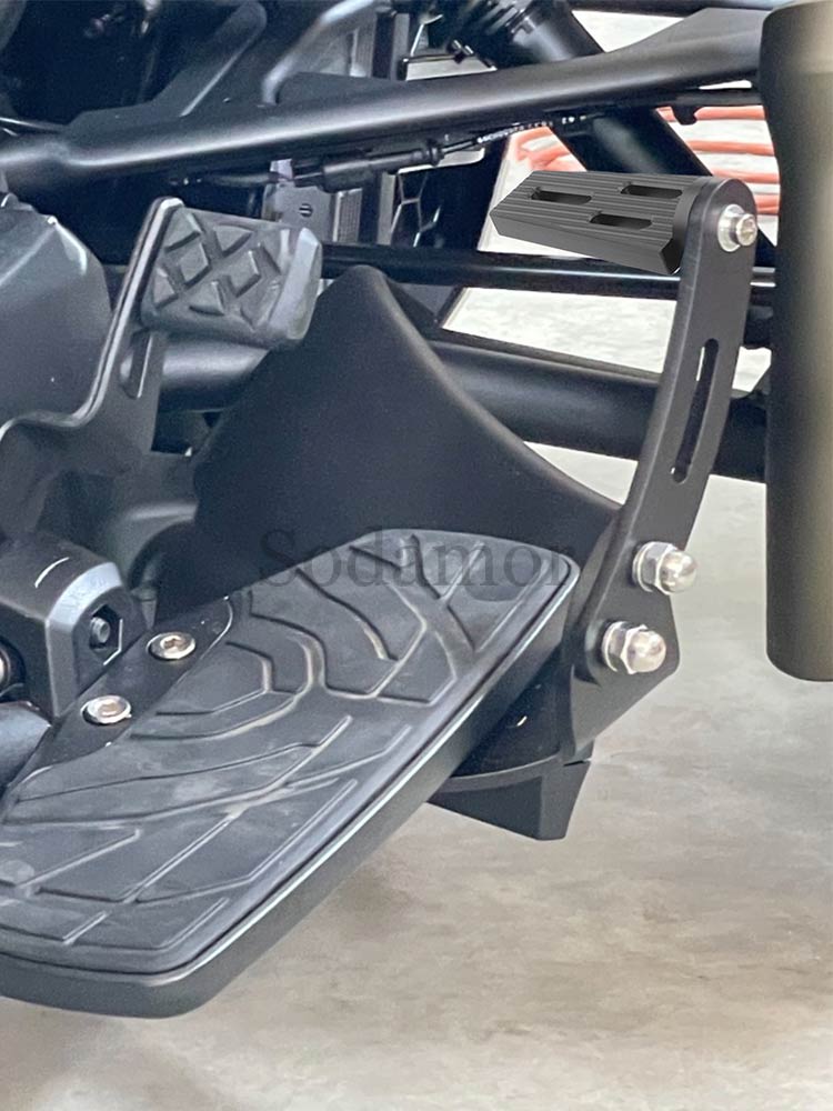 As you know for Spyder F3 is wind buffeting on feet when traveling at highway speeds. Our bolt on foot rest extensions allow you to center feet across the stock peg and the foot peg extensions for a much more balanced foot position while cruising and improve riding safety.The foot peg can also be used as highway pegs for more comfortable leg position when traveling on freeways or long rides.Especially for riders with long legs, it is a must-have highway pegs.