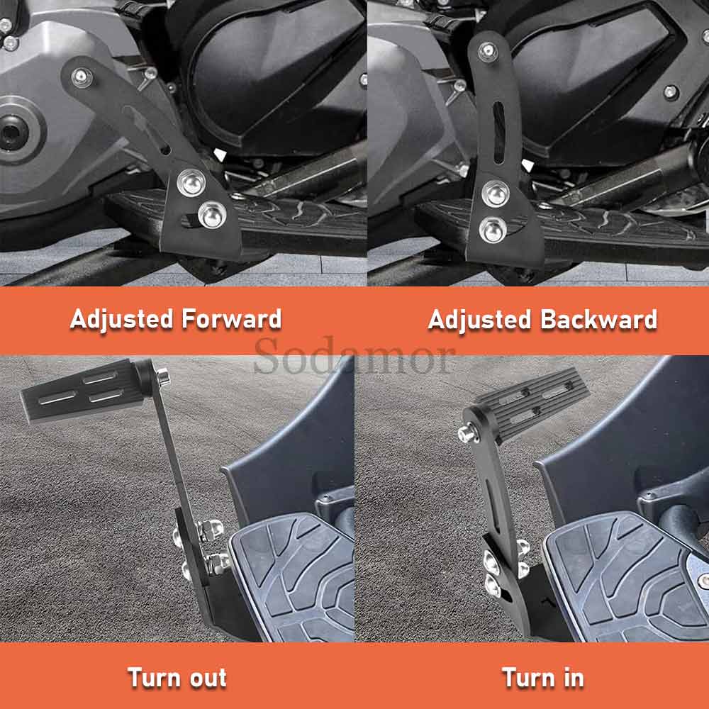 ADJUSTABLE HEIGHTS AND ANGLE:These Foot Rest Extensions were designed to compliment the curves and angles of the F3. And can be adjusted forward and backward 30 degrees, 3.5'' height difference, as well as left and right angle adjustments, Foot pegs can be mounted either inwards or outwards,allowing you to adjust the kit for your preferred riding style.