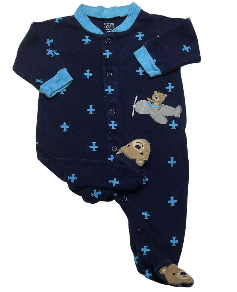 Lot of "5" total pieces of baby Boy's Carter's one piece sleeper pajamas in sizes 3 months. Brands include Carter's, Carter's Just One You and Carter's Little Planet Organic. Materials are 100% cotton, cotton blend and terry. One snap closure all others are zip up.