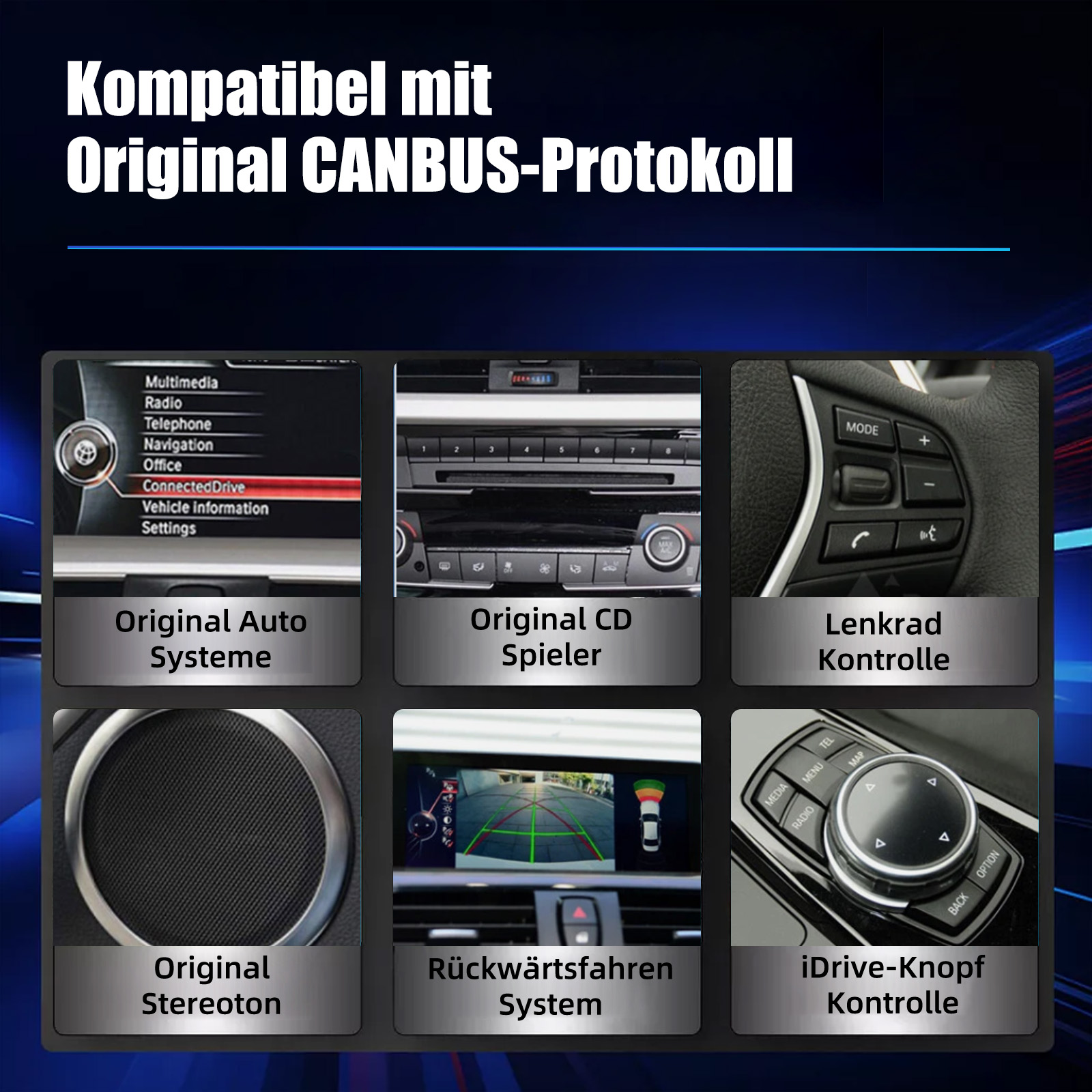 - Eingebauter Can-Bus-Decoder, kompatibel mit den meisten Lenkrad-Steuerungsfunktionen und Original-Auto-Idrive-Knopf.