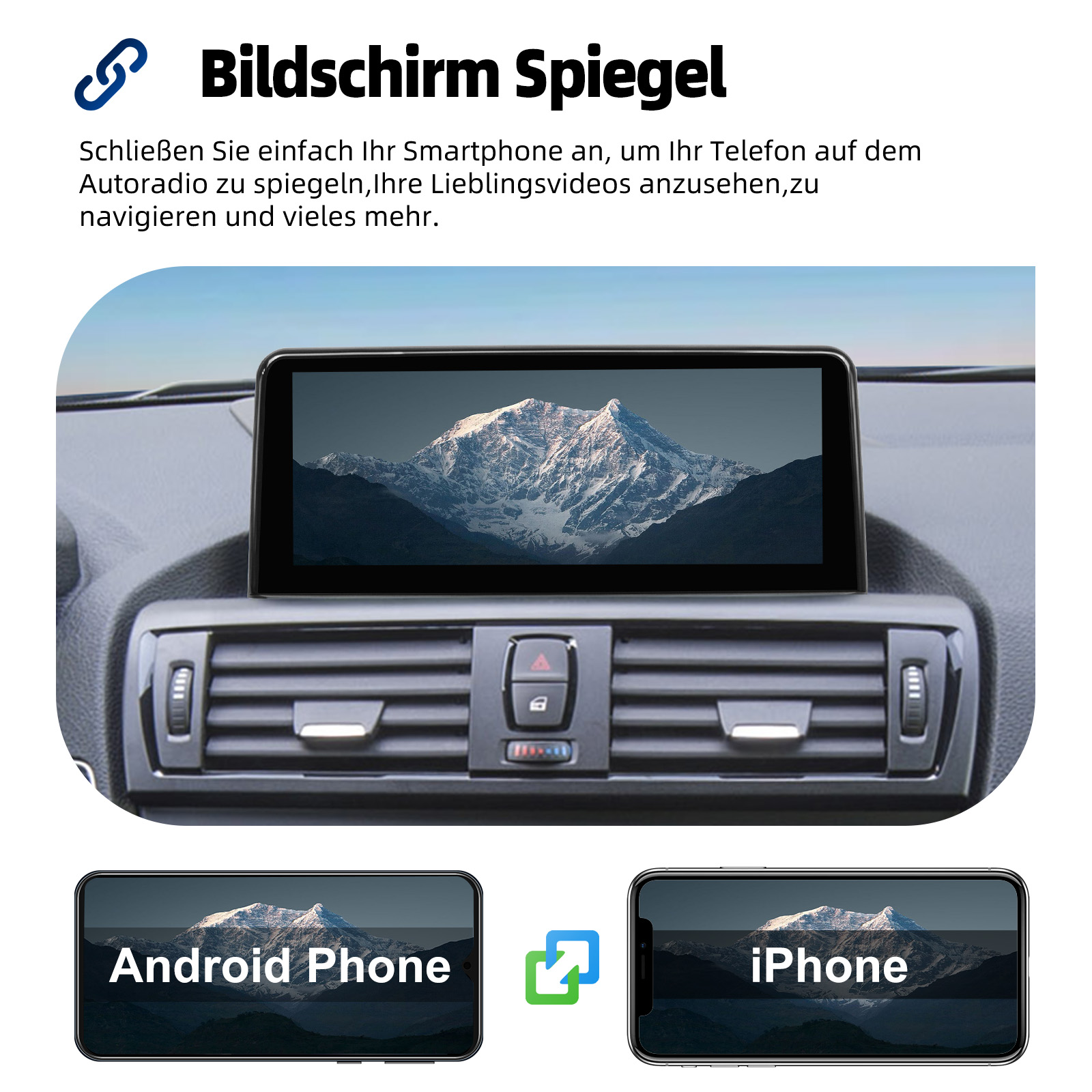 Mirror Link: Mit diesem Autoradio erleben Sie die beeindruckende Mirror-Link-Funktion, die mit iOS- und Android-Telefonen kompatibel ist. Sie können den Bildschirm Ihres Smartphones auf das Autoradio spiegeln und dabei Apps wie Google Maps, Spotify, Youtube usw. nutzen. Ersetzen Sie Ihr Mobiltelefon durch den Autobildschirm und verwandeln Sie Ihr Fahrzeug in eine intelligente Plattform.