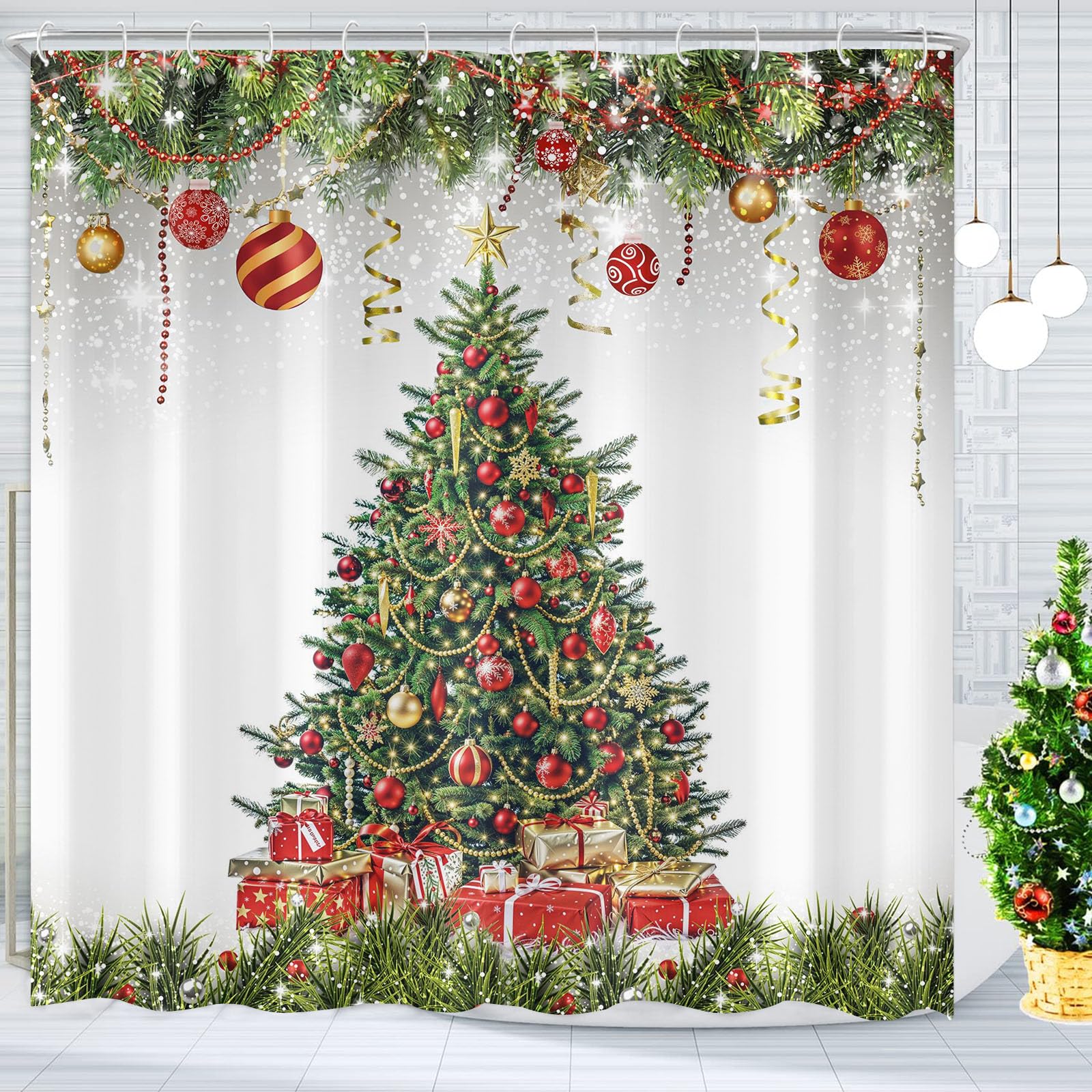 - Festive Christmas Tree Design: Featuring a beautifully decorated Christmas tree with ornaments, gifts, and garlands, this shower curtain brings the warmth and joy of the holiday season to your bathroom decor.