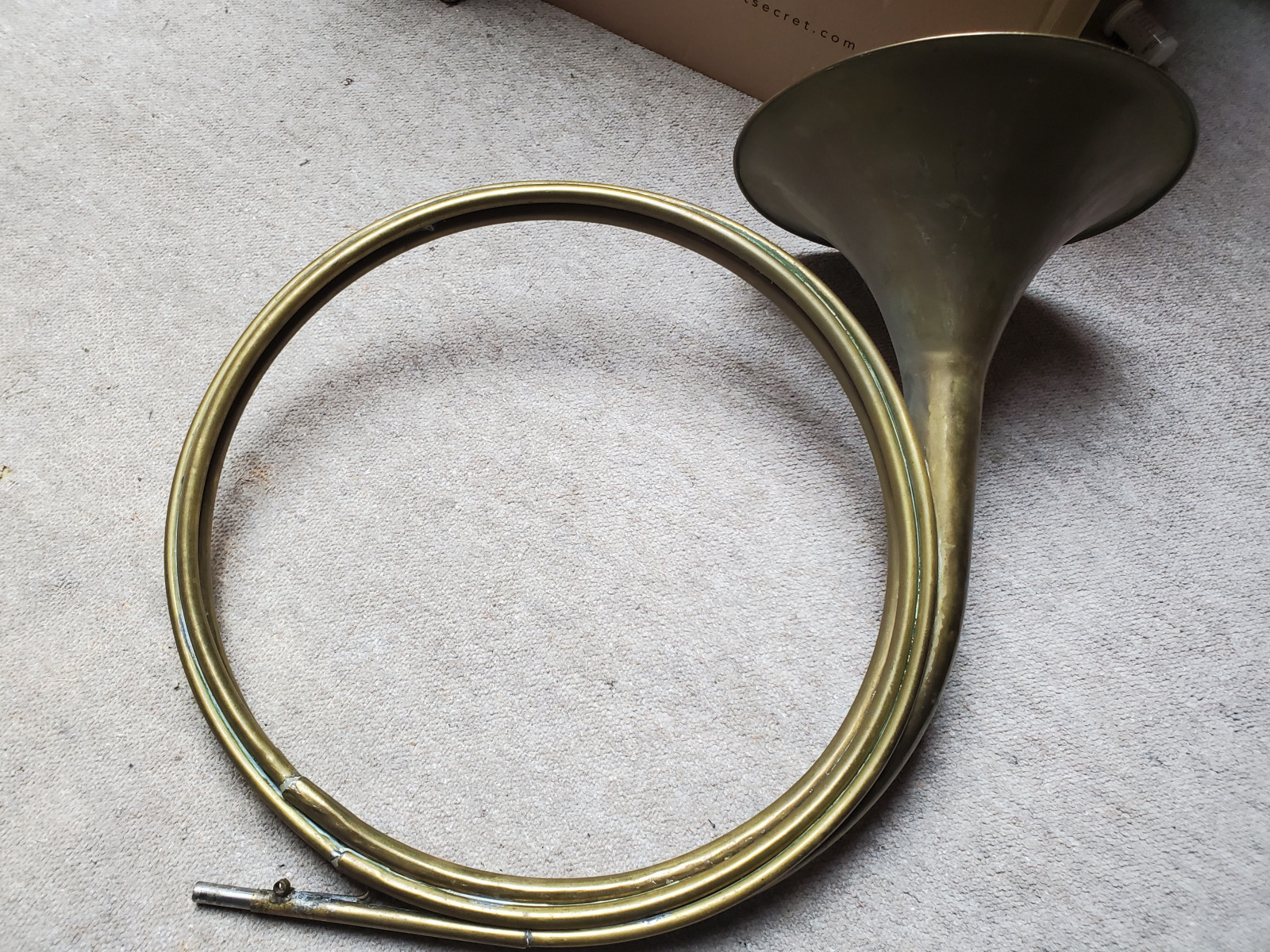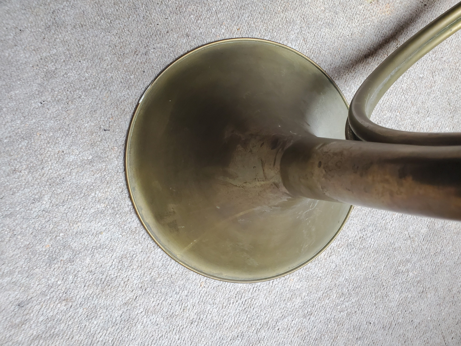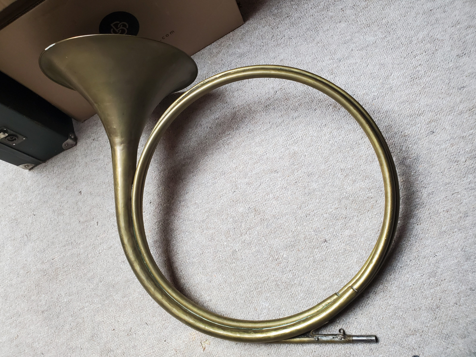 Großes altes Horn. Das Instrument muss überholt, repariert und gereinigt / aufpoliert werden. Einen Herstellerhinweis habe ich nicht entdeckt. Das Instrument muss am Stimmzug (Mundrohr) repariert und ergänzt werden. , Bitte beachten Sie sämtliche Photos! . Der Zustand ist auf den Bildern recht gut zu erkennen. Trichterdurchmesser ca.26 cm. Auf dem Trichter stehend, ist das Instrument ca. 45 cm hoch. Die Stimmung ist mir leider nicht bekannt. Das Instrument muss überholt, gereinigt und repariert werden. International bidders are welcome. old parforcehorn , needs repair.
