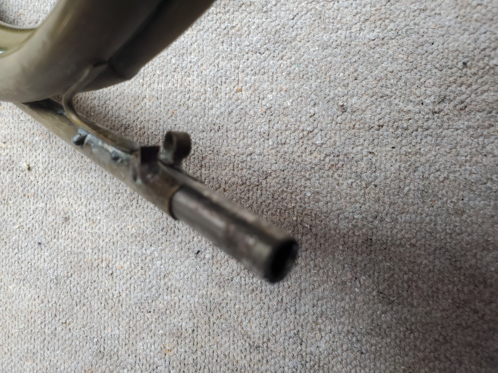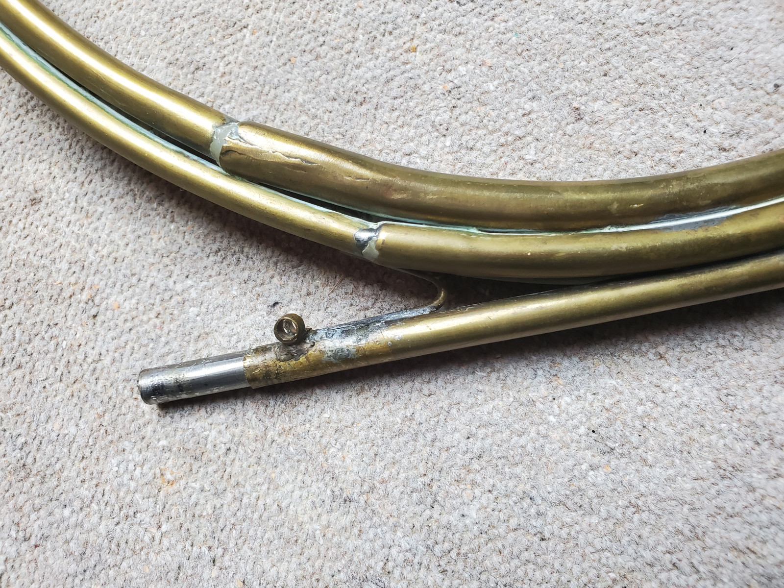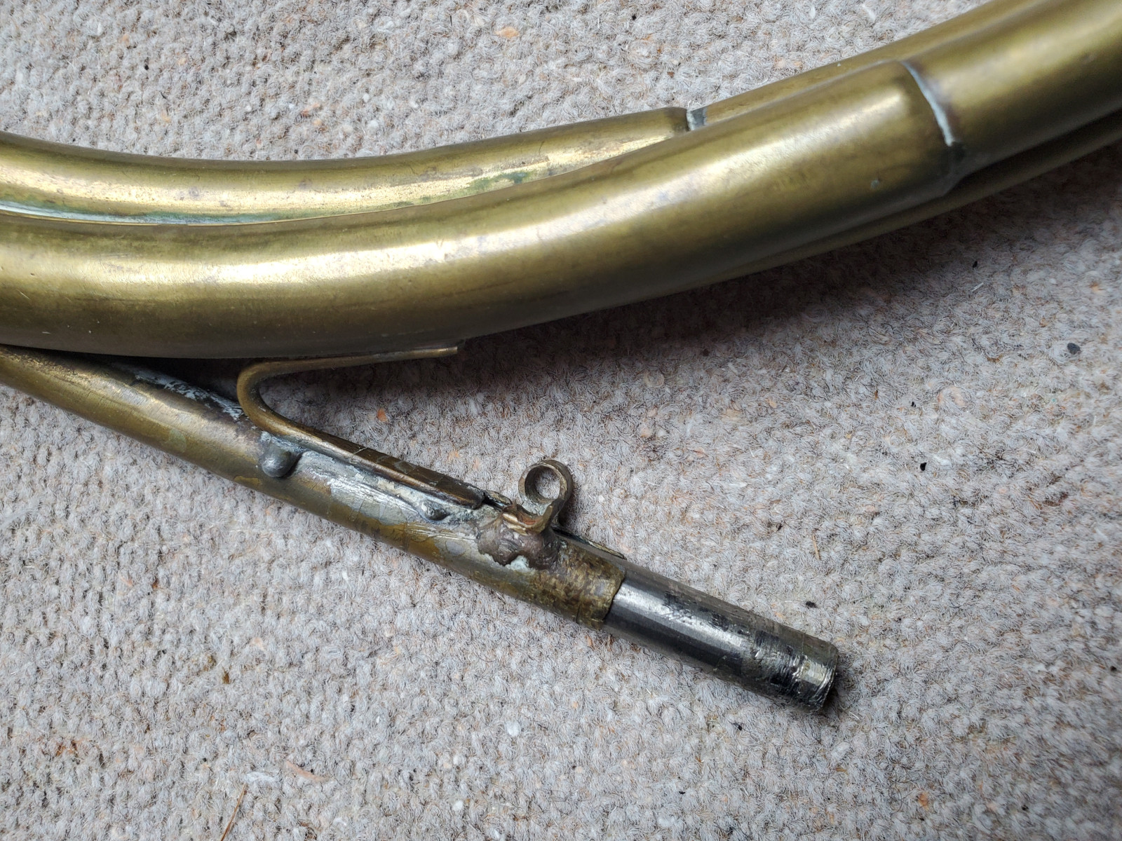 Großes altes Horn. Das Instrument muss überholt, repariert und gereinigt / aufpoliert werden. Einen Herstellerhinweis habe ich nicht entdeckt. Das Instrument muss am Stimmzug (Mundrohr) repariert und ergänzt werden. , Bitte beachten Sie sämtliche Photos! . Der Zustand ist auf den Bildern recht gut zu erkennen. Trichterdurchmesser ca.26 cm. Auf dem Trichter stehend, ist das Instrument ca. 45 cm hoch. Die Stimmung ist mir leider nicht bekannt. Das Instrument muss überholt, gereinigt und repariert werden. International bidders are welcome. old parforcehorn , needs repair.