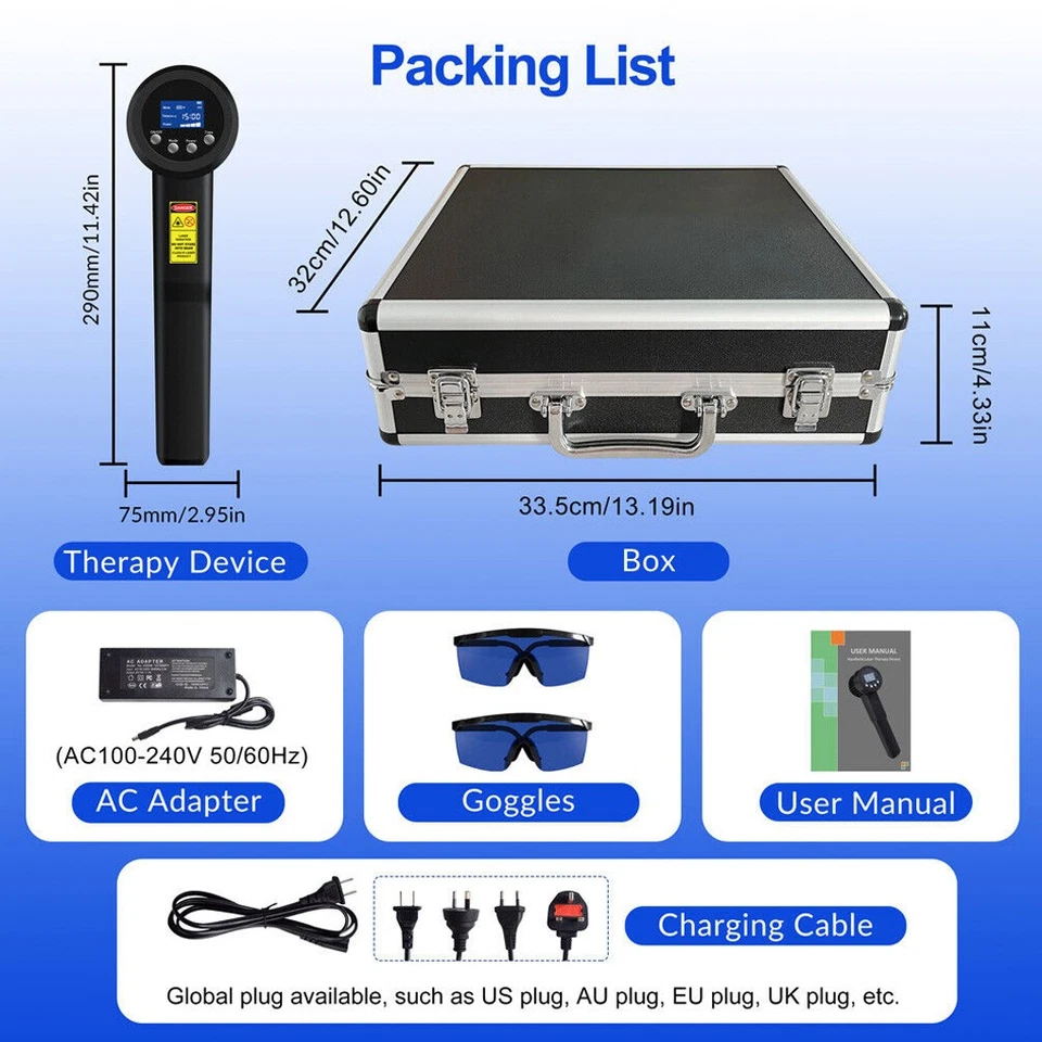 This laser therapy product includes 1* handheld Cold Laser Therapy Device, 1* AC Adapter, 1* Cable, 2* Eye Protection Glasses, and 1* User Manual. We provide one year warranty, you can contact us if you have any questions, and we will reply to you within 24 hours.
