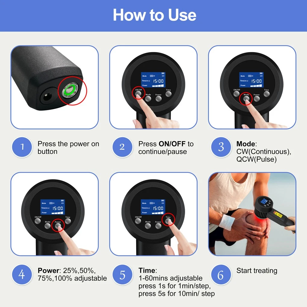 3.Cold laser should be used tightly against the skin without wearing clothes,move the laser back and forth in the treatment area repeat this process until you have reached your desired treatment time.
