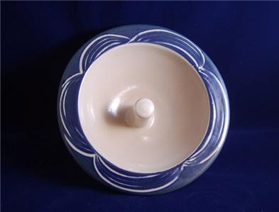 Mine is a grayish tan color glaze with a blue swirl design. (The bottom is un-glazed and shows the red clay.)