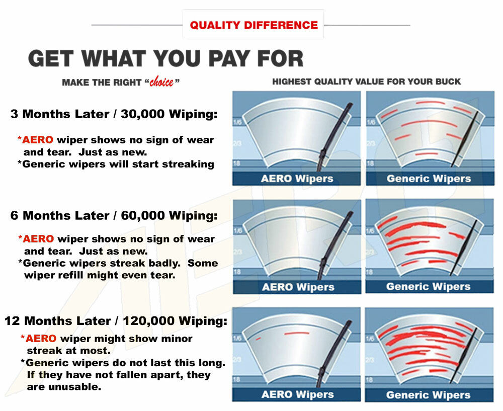 This eBay listing contains 2 pieces genuine AERO all-season wiper blades. AERO wipers are made with premium quality rubber with DuPont coating that offer superior wiping performance and have a much longer lifespan than the conventional rubber type. Our wiper blades fit vehicles with the following sizes: