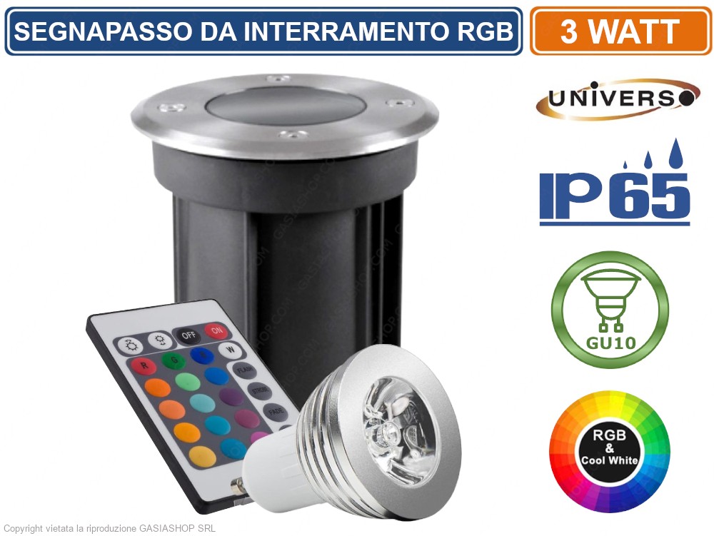 Portalampada da interramento con lampada RGB GU10 da 3W inclusa. Ideale per illuminazione a terra di piante e cortili. Molto robusto grazie alla corona superiore in acciaio inox e alluminio e copertura in vetro temperato. Perfetto per essere posizionato anche nelle zone calpestabili. Completo di cassero in materiale plastico nero e portalampada per un faretto GU10 (non incluso), che potete trovare nel nostro negozio.